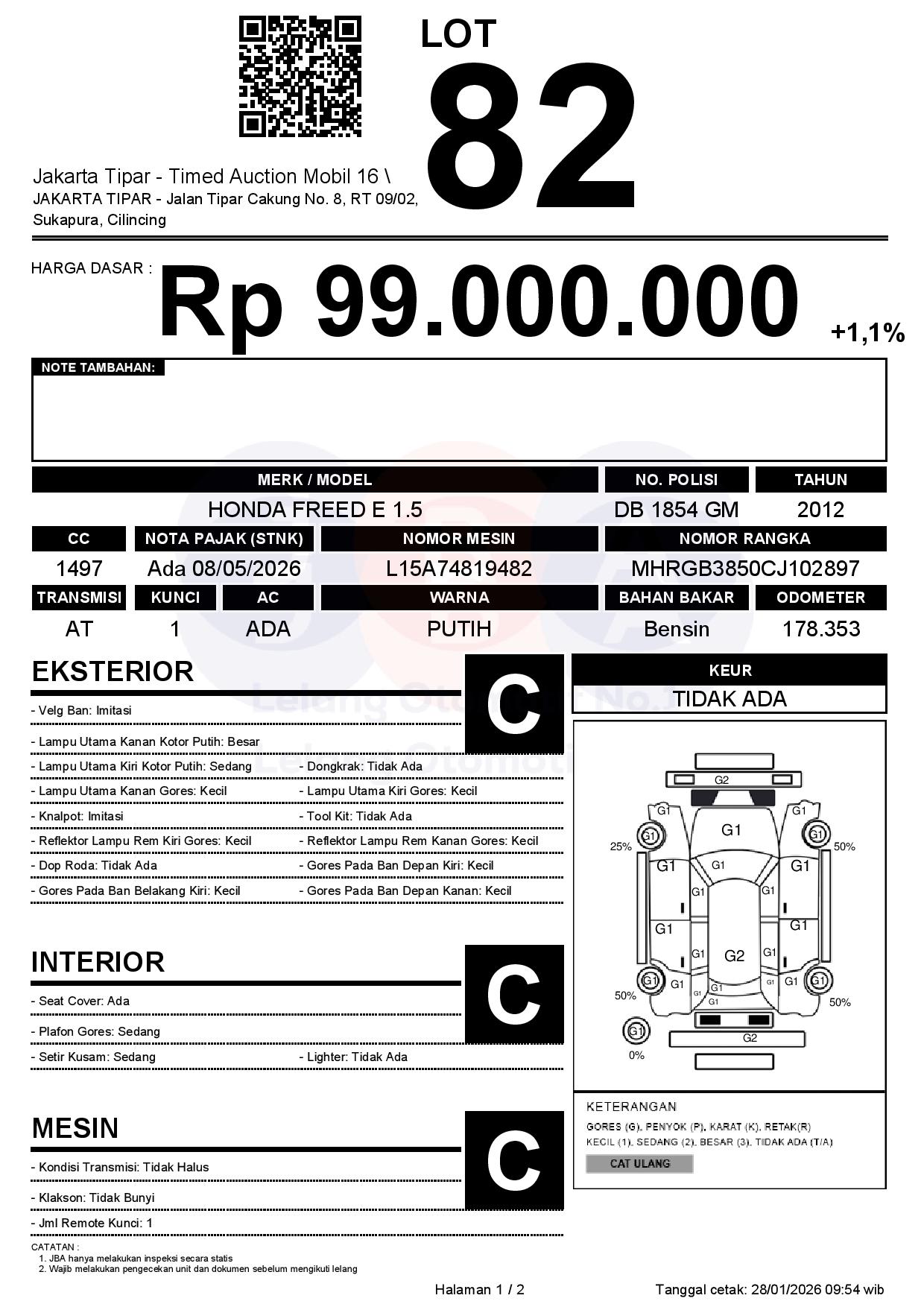 - Kondisi objek lelang dilelang apa adanya, baik kondisi fisik, mesin maupun legalitas kendaraan. Jika terdapat kekurangan/cacat baik yang terlihat maupun yang tidak terlihat, maka semua akan menjadi tanggung jawab/risiko Pemenang Lelang. Oleh karena itu, Pemenang Lelang melepaskan segala hak untuk menuntut dan/atau meminta ganti rugi atas hal tersebut kepada JBA.