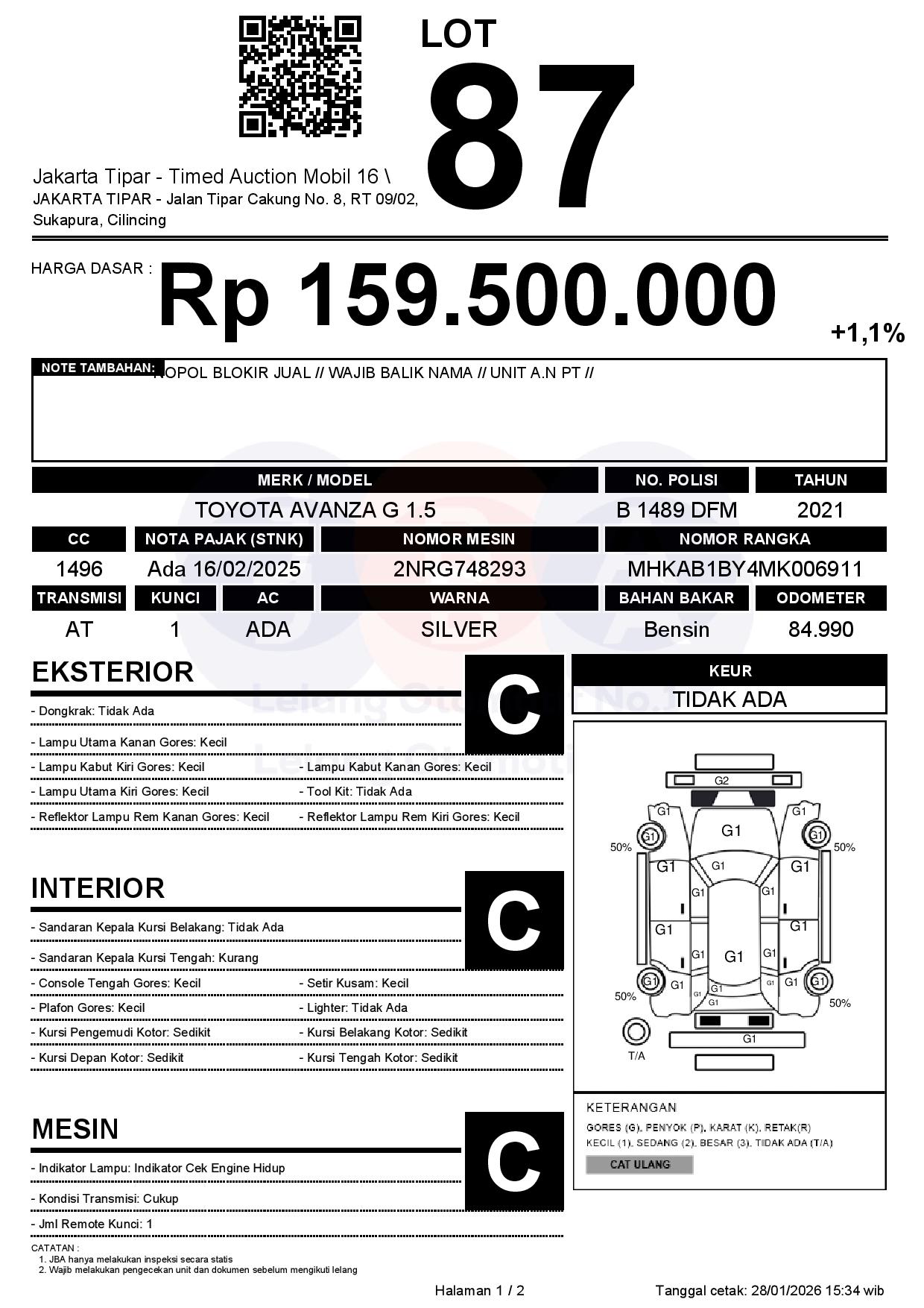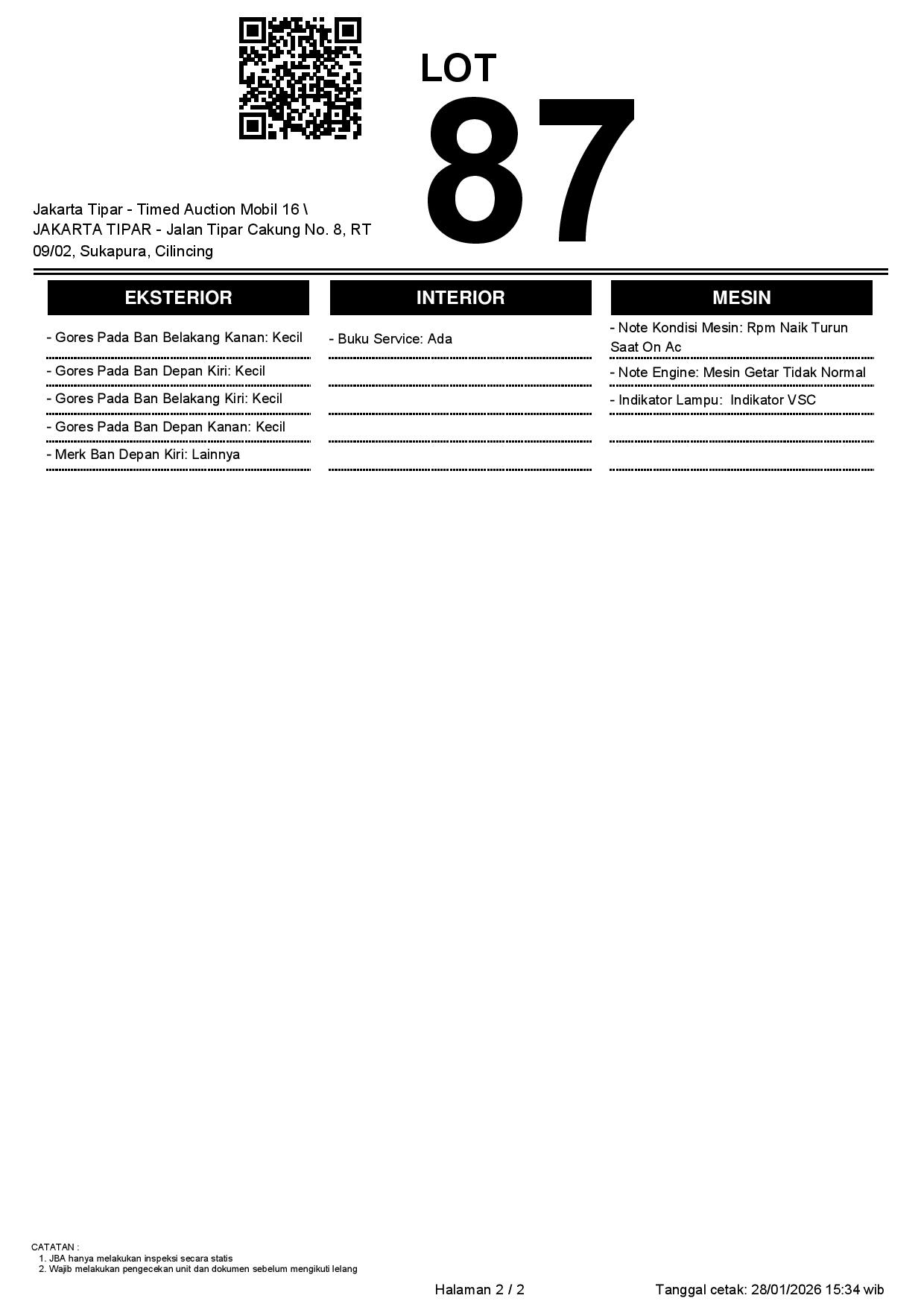 - Kondisi objek lelang dilelang apa adanya, baik kondisi fisik, mesin maupun legalitas kendaraan. Jika terdapat kekurangan/cacat baik yang terlihat maupun yang tidak terlihat, maka semua akan menjadi tanggung jawab/risiko Pemenang Lelang. Oleh karena itu, Pemenang Lelang melepaskan segala hak untuk menuntut dan/atau meminta ganti rugi atas hal tersebut kepada JBA.