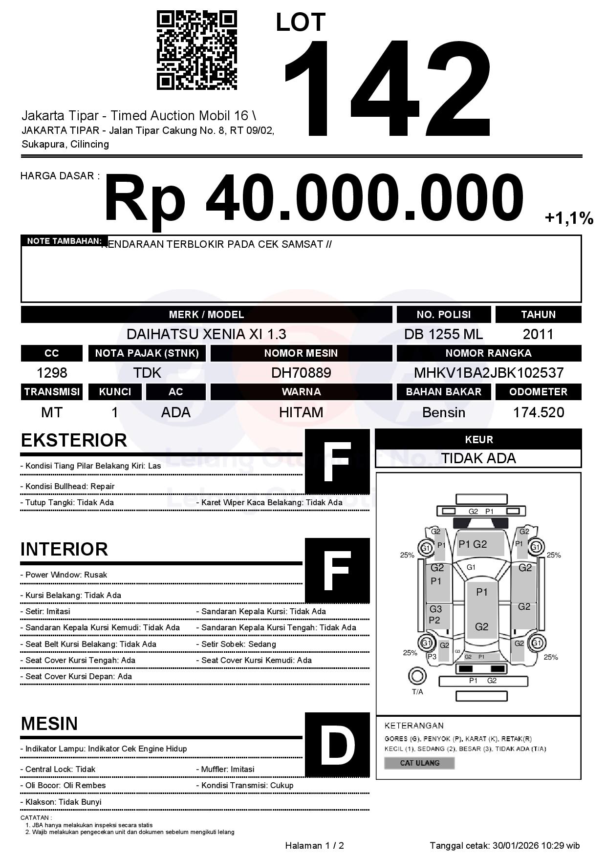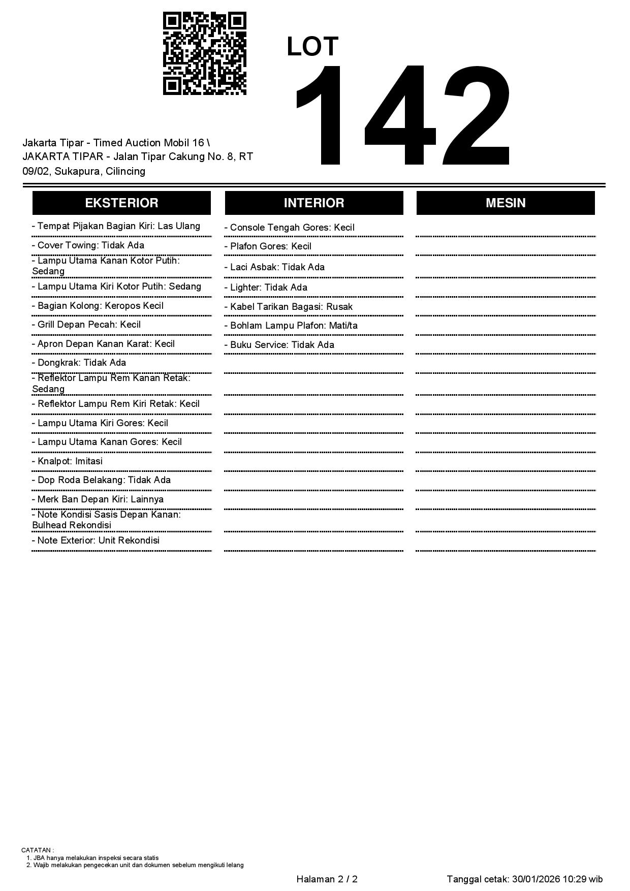 - Kondisi objek lelang dilelang apa adanya, baik kondisi fisik, mesin maupun legalitas kendaraan. Jika terdapat kekurangan/cacat baik yang terlihat maupun yang tidak terlihat, maka semua akan menjadi tanggung jawab/risiko Pemenang Lelang. Oleh karena itu, Pemenang Lelang melepaskan segala hak untuk menuntut dan/atau meminta ganti rugi atas hal tersebut kepada JBA.
