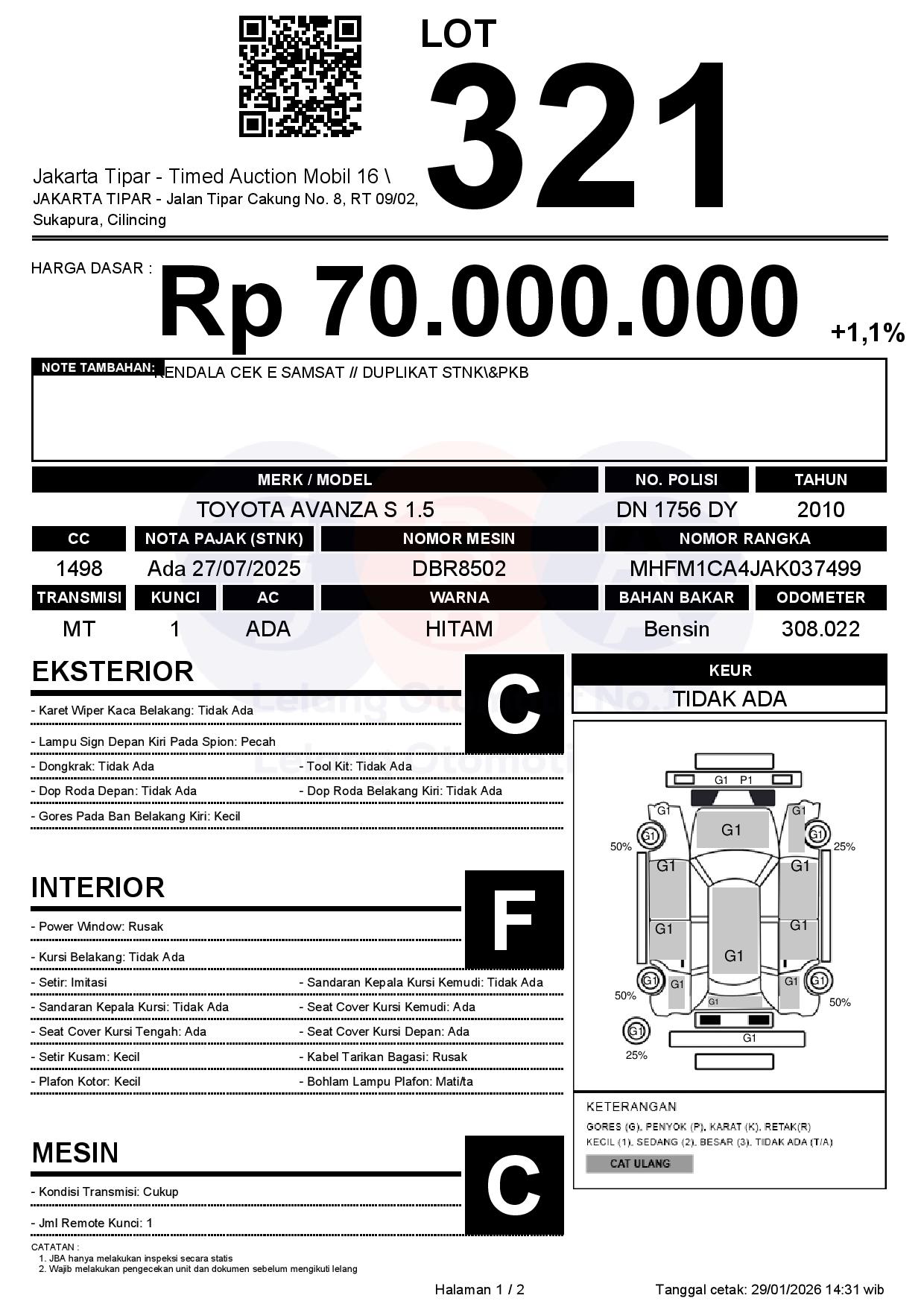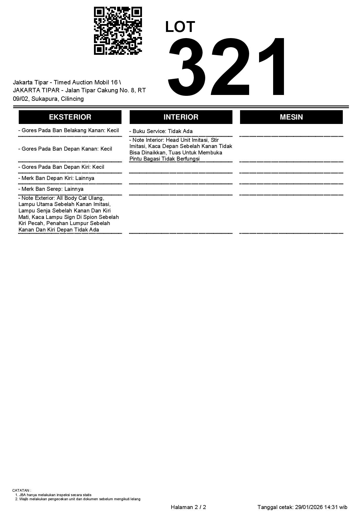 - Kondisi objek lelang dilelang apa adanya, baik kondisi fisik, mesin maupun legalitas kendaraan. Jika terdapat kekurangan/cacat baik yang terlihat maupun yang tidak terlihat, maka semua akan menjadi tanggung jawab/risiko Pemenang Lelang. Oleh karena itu, Pemenang Lelang melepaskan segala hak untuk menuntut dan/atau meminta ganti rugi atas hal tersebut kepada JBA.