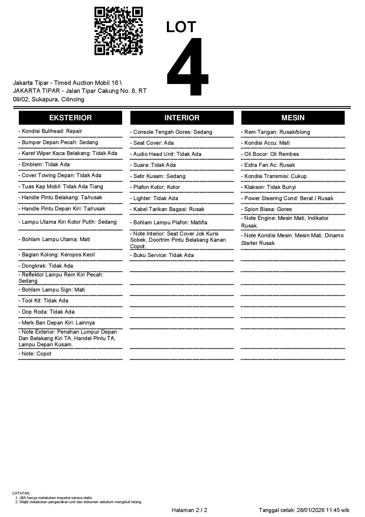 - Kondisi objek lelang dilelang apa adanya, baik kondisi fisik, mesin maupun legalitas kendaraan. Jika terdapat kekurangan/cacat baik yang terlihat maupun yang tidak terlihat, maka semua akan menjadi tanggung jawab/risiko Pemenang Lelang. Oleh karena itu, Pemenang Lelang melepaskan segala hak untuk menuntut dan/atau meminta ganti rugi atas hal tersebut kepada JBA.