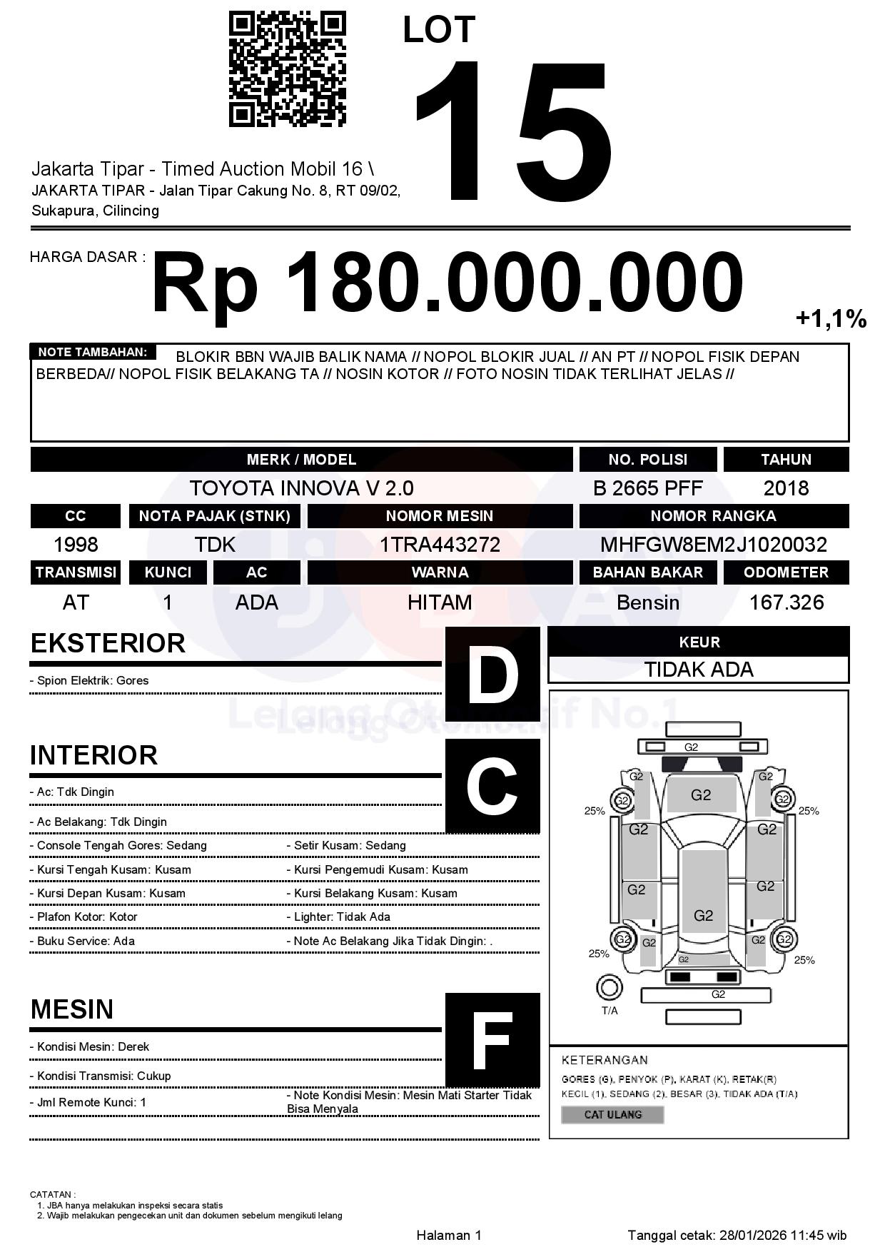 - Kondisi objek lelang dilelang apa adanya, baik kondisi fisik, mesin maupun legalitas kendaraan. Jika terdapat kekurangan/cacat baik yang terlihat maupun yang tidak terlihat, maka semua akan menjadi tanggung jawab/risiko Pemenang Lelang. Oleh karena itu, Pemenang Lelang melepaskan segala hak untuk menuntut dan/atau meminta ganti rugi atas hal tersebut kepada JBA.