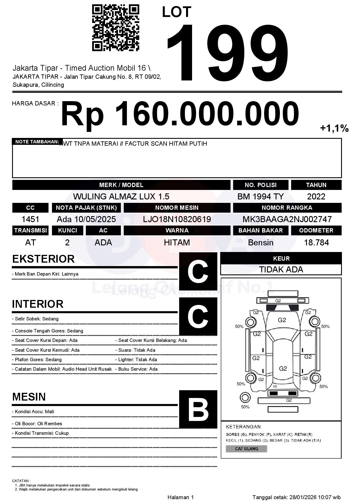 - Kondisi objek lelang dilelang apa adanya, baik kondisi fisik, mesin maupun legalitas kendaraan. Jika terdapat kekurangan/cacat baik yang terlihat maupun yang tidak terlihat, maka semua akan menjadi tanggung jawab/risiko Pemenang Lelang. Oleh karena itu, Pemenang Lelang melepaskan segala hak untuk menuntut dan/atau meminta ganti rugi atas hal tersebut kepada JBA.