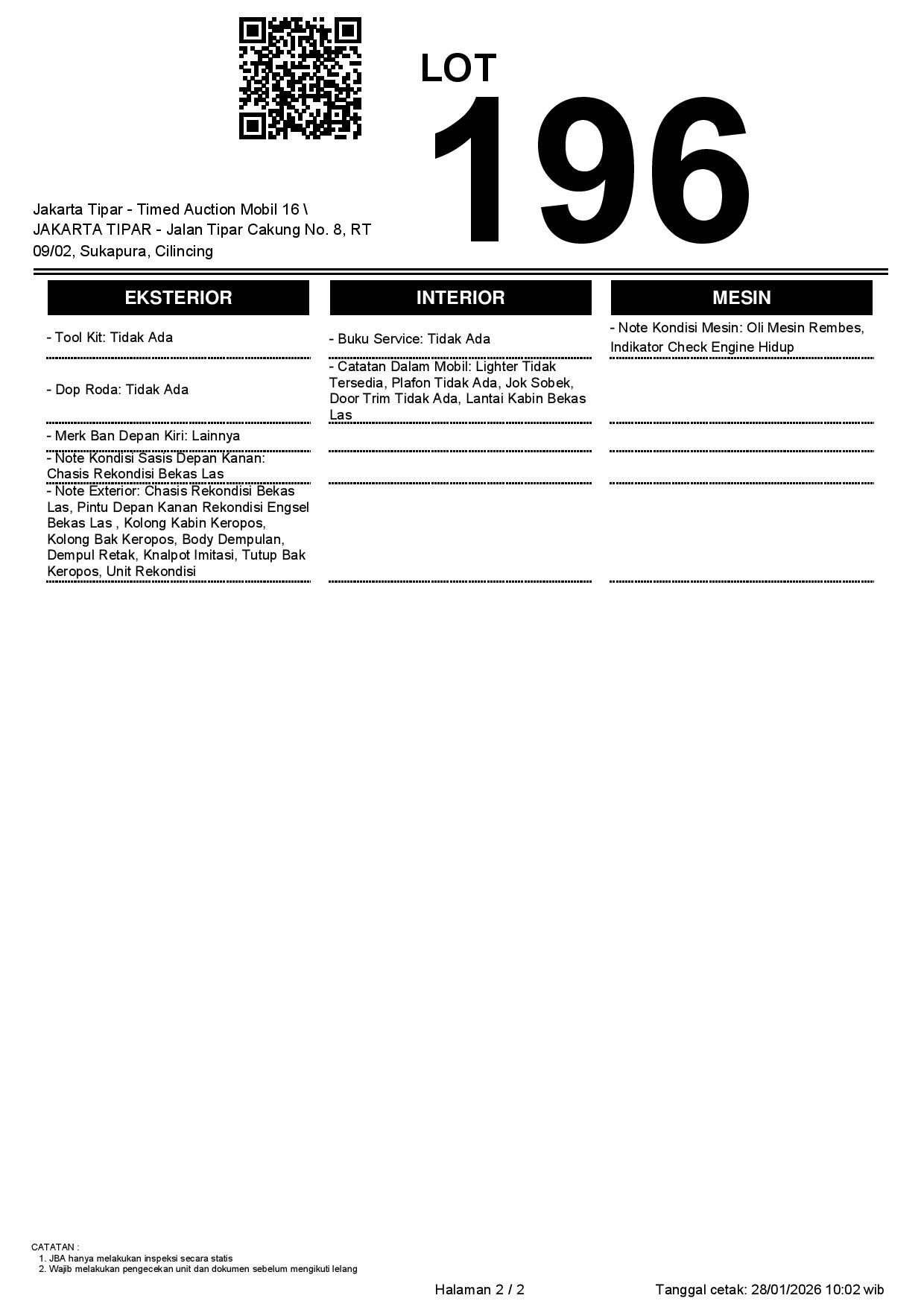 - Kondisi objek lelang dilelang apa adanya, baik kondisi fisik, mesin maupun legalitas kendaraan. Jika terdapat kekurangan/cacat baik yang terlihat maupun yang tidak terlihat, maka semua akan menjadi tanggung jawab/risiko Pemenang Lelang. Oleh karena itu, Pemenang Lelang melepaskan segala hak untuk menuntut dan/atau meminta ganti rugi atas hal tersebut kepada JBA.