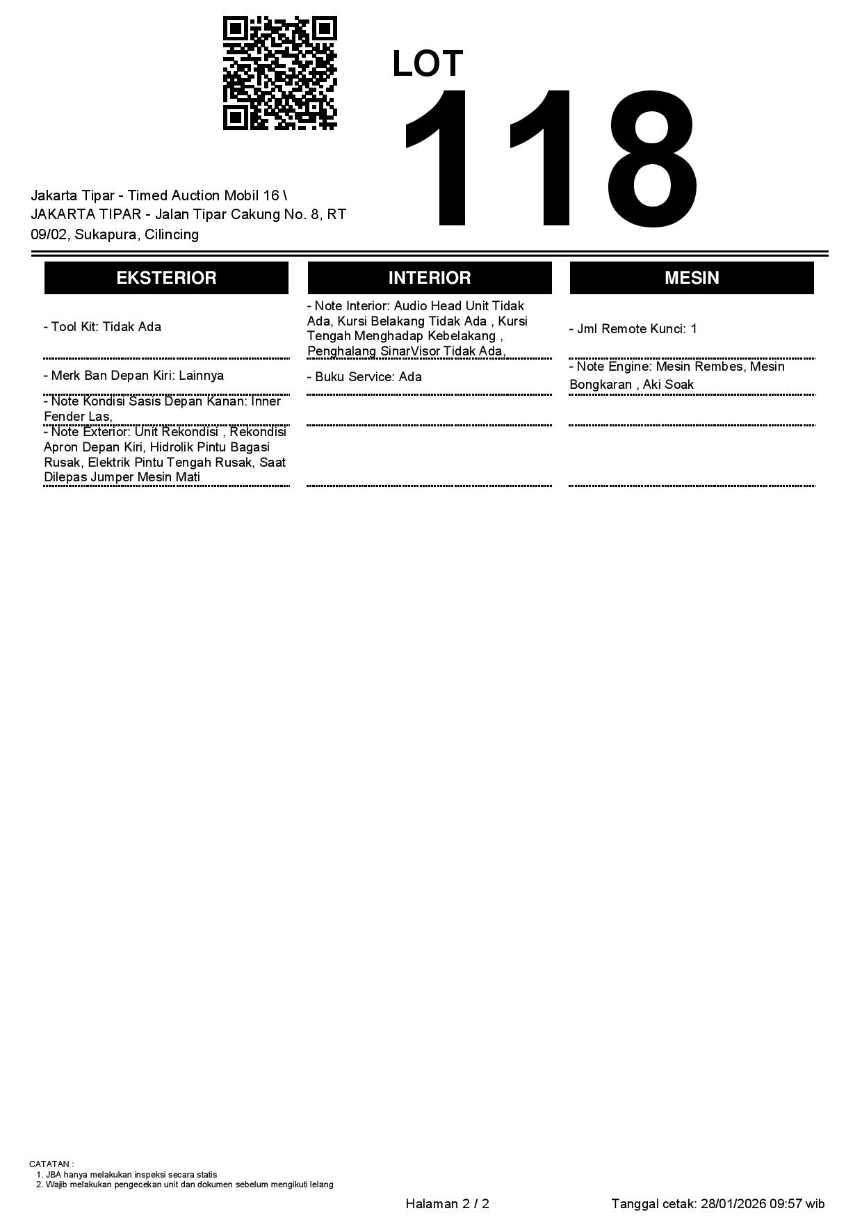- Kondisi objek lelang dilelang apa adanya, baik kondisi fisik, mesin maupun legalitas kendaraan. Jika terdapat kekurangan/cacat baik yang terlihat maupun yang tidak terlihat, maka semua akan menjadi tanggung jawab/risiko Pemenang Lelang. Oleh karena itu, Pemenang Lelang melepaskan segala hak untuk menuntut dan/atau meminta ganti rugi atas hal tersebut kepada JBA.