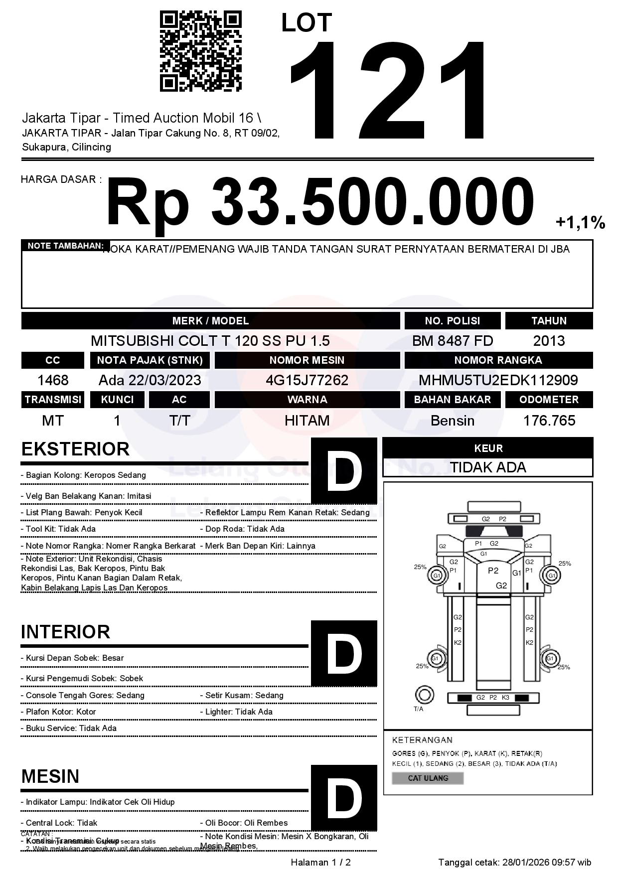 - Kondisi objek lelang dilelang apa adanya, baik kondisi fisik, mesin maupun legalitas kendaraan. Jika terdapat kekurangan/cacat baik yang terlihat maupun yang tidak terlihat, maka semua akan menjadi tanggung jawab/risiko Pemenang Lelang. Oleh karena itu, Pemenang Lelang melepaskan segala hak untuk menuntut dan/atau meminta ganti rugi atas hal tersebut kepada JBA.
