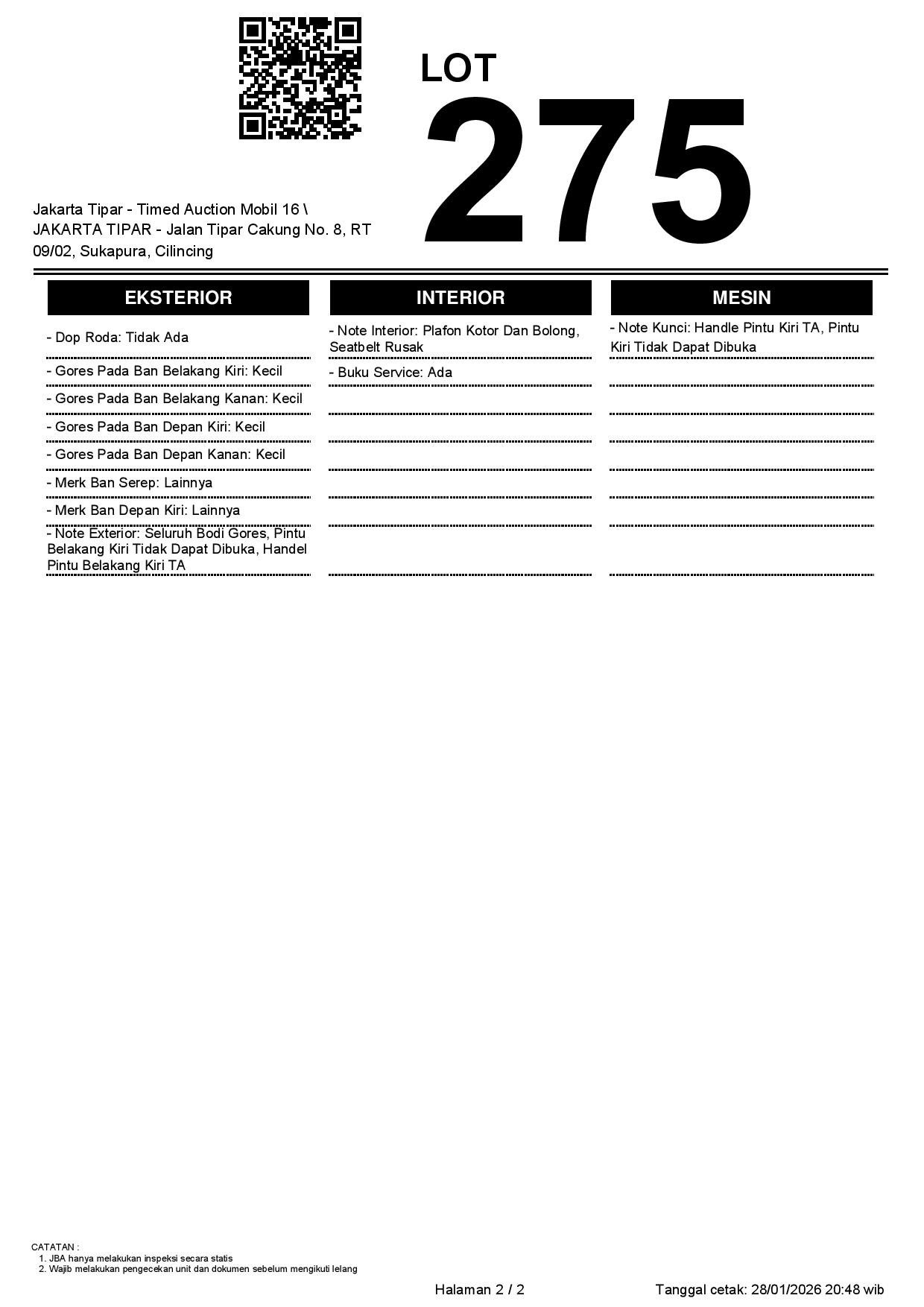 - Kondisi objek lelang dilelang apa adanya, baik kondisi fisik, mesin maupun legalitas kendaraan. Jika terdapat kekurangan/cacat baik yang terlihat maupun yang tidak terlihat, maka semua akan menjadi tanggung jawab/risiko Pemenang Lelang. Oleh karena itu, Pemenang Lelang melepaskan segala hak untuk menuntut dan/atau meminta ganti rugi atas hal tersebut kepada JBA.