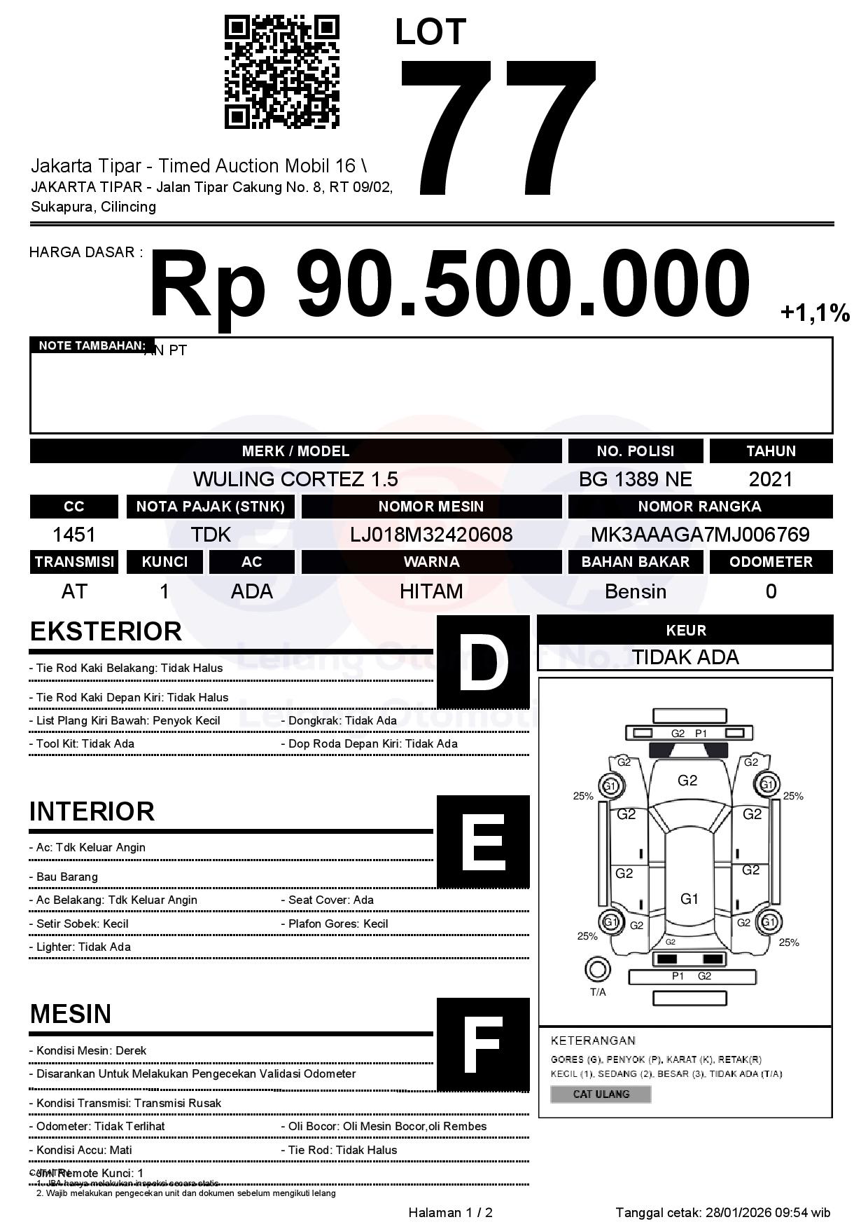 - Kondisi objek lelang dilelang apa adanya, baik kondisi fisik, mesin maupun legalitas kendaraan. Jika terdapat kekurangan/cacat baik yang terlihat maupun yang tidak terlihat, maka semua akan menjadi tanggung jawab/risiko Pemenang Lelang. Oleh karena itu, Pemenang Lelang melepaskan segala hak untuk menuntut dan/atau meminta ganti rugi atas hal tersebut kepada JBA.