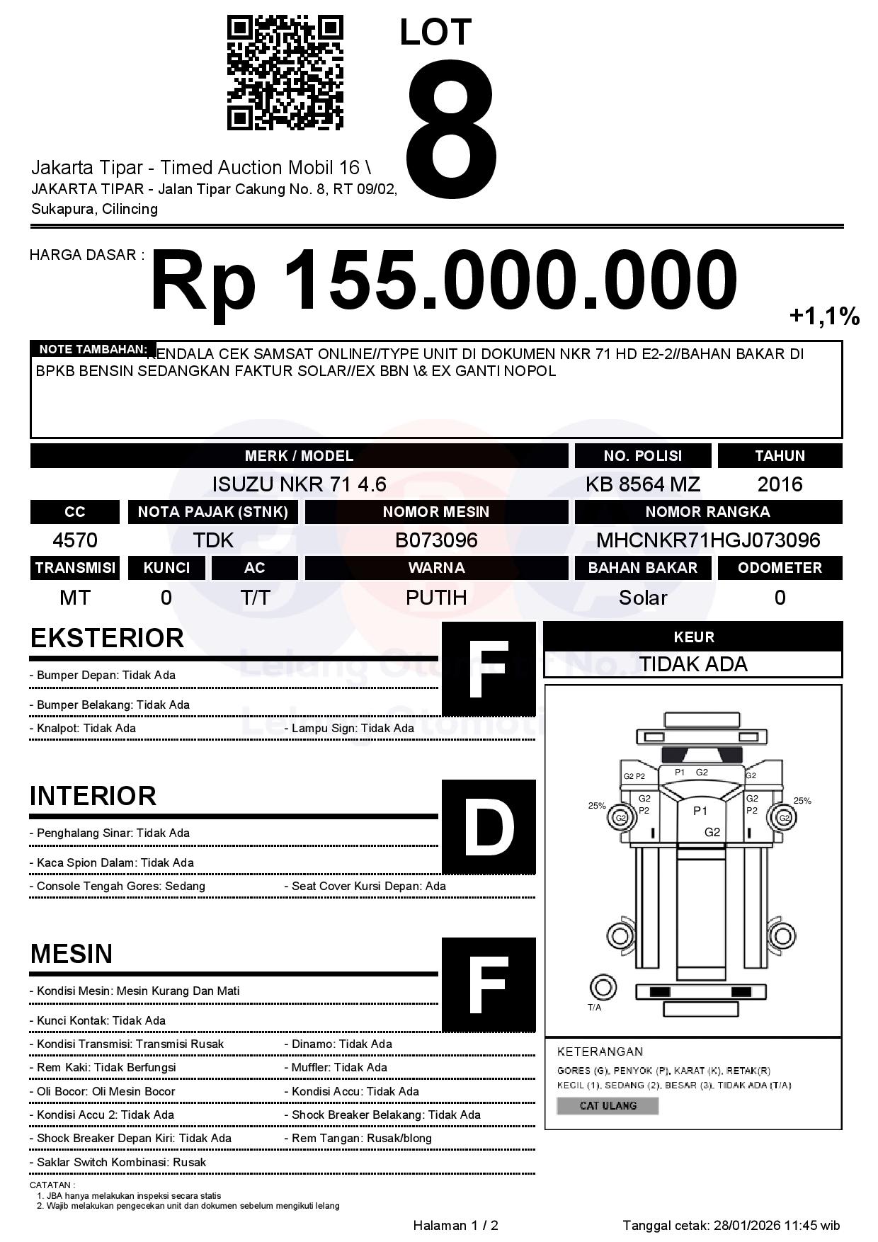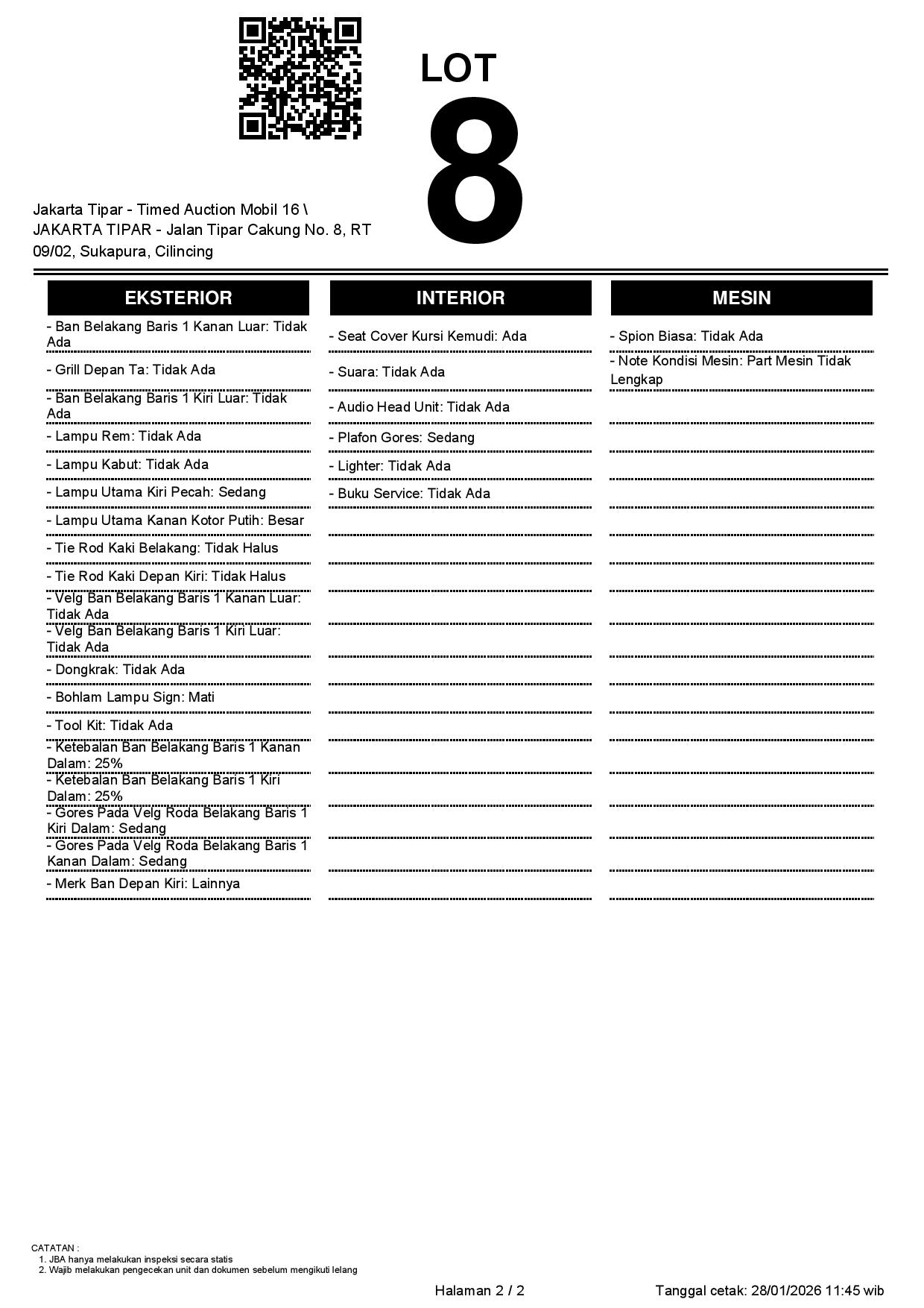 - Kondisi objek lelang dilelang apa adanya, baik kondisi fisik, mesin maupun legalitas kendaraan. Jika terdapat kekurangan/cacat baik yang terlihat maupun yang tidak terlihat, maka semua akan menjadi tanggung jawab/risiko Pemenang Lelang. Oleh karena itu, Pemenang Lelang melepaskan segala hak untuk menuntut dan/atau meminta ganti rugi atas hal tersebut kepada JBA.