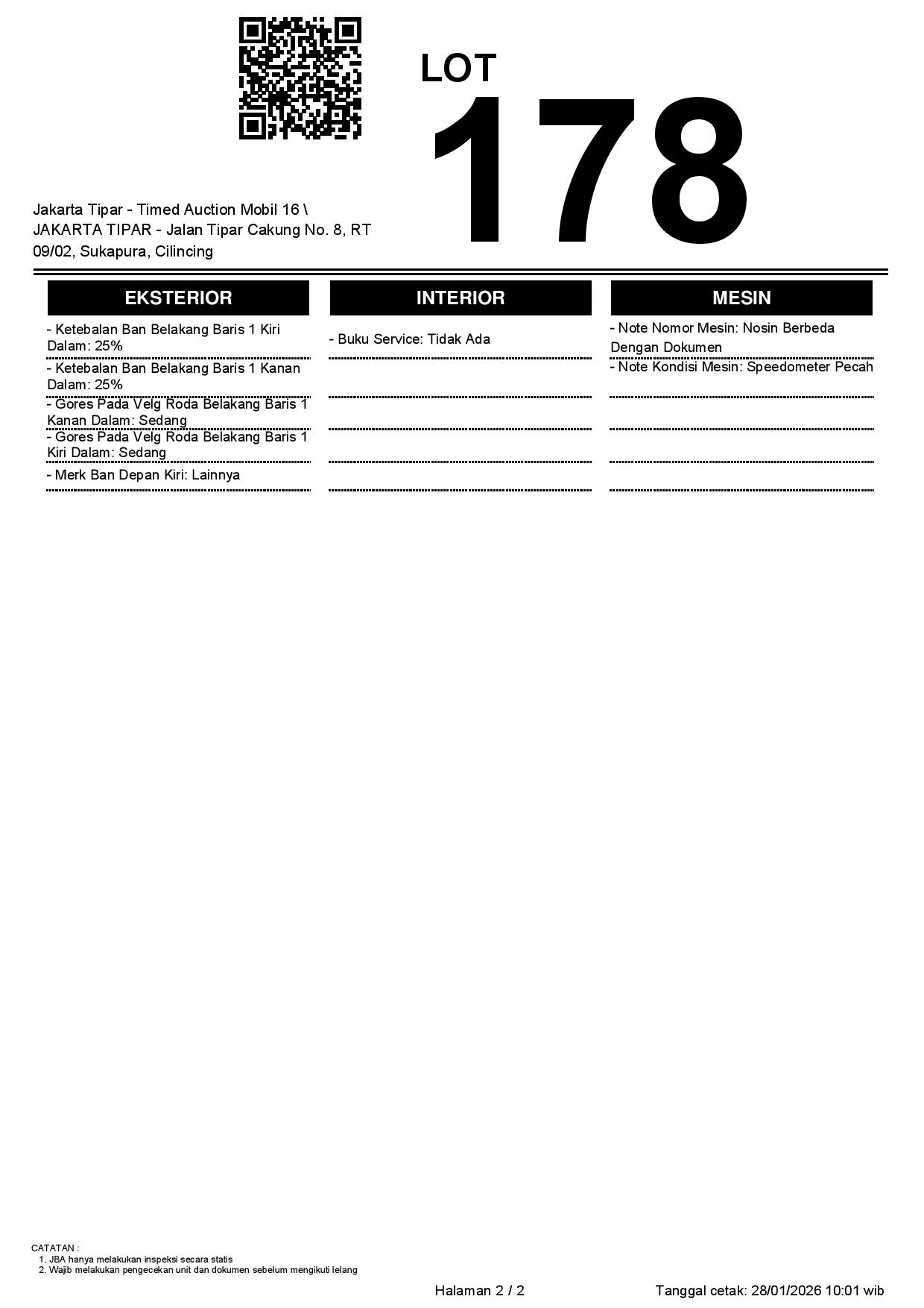 - Kondisi objek lelang dilelang apa adanya, baik kondisi fisik, mesin maupun legalitas kendaraan. Jika terdapat kekurangan/cacat baik yang terlihat maupun yang tidak terlihat, maka semua akan menjadi tanggung jawab/risiko Pemenang Lelang. Oleh karena itu, Pemenang Lelang melepaskan segala hak untuk menuntut dan/atau meminta ganti rugi atas hal tersebut kepada JBA.