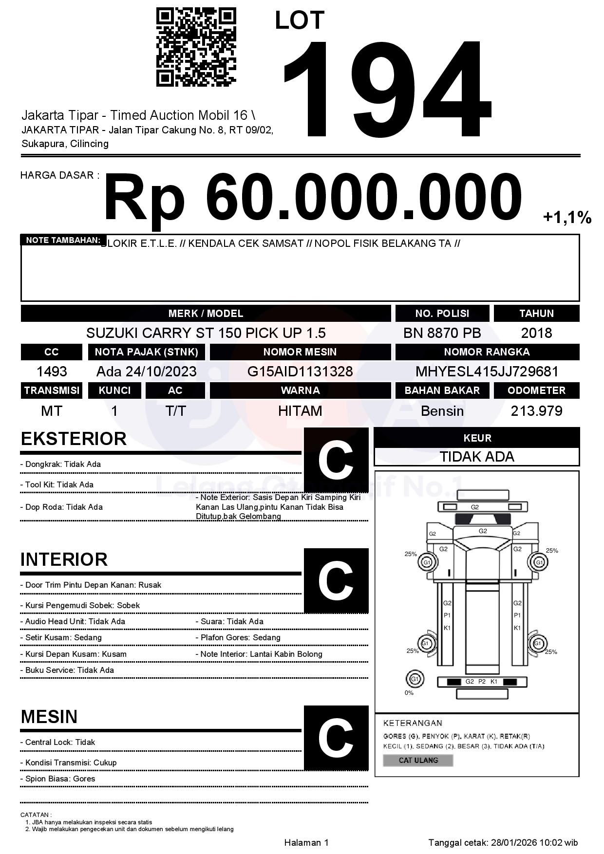- Kondisi objek lelang dilelang apa adanya, baik kondisi fisik, mesin maupun legalitas kendaraan. Jika terdapat kekurangan/cacat baik yang terlihat maupun yang tidak terlihat, maka semua akan menjadi tanggung jawab/risiko Pemenang Lelang. Oleh karena itu, Pemenang Lelang melepaskan segala hak untuk menuntut dan/atau meminta ganti rugi atas hal tersebut kepada JBA.