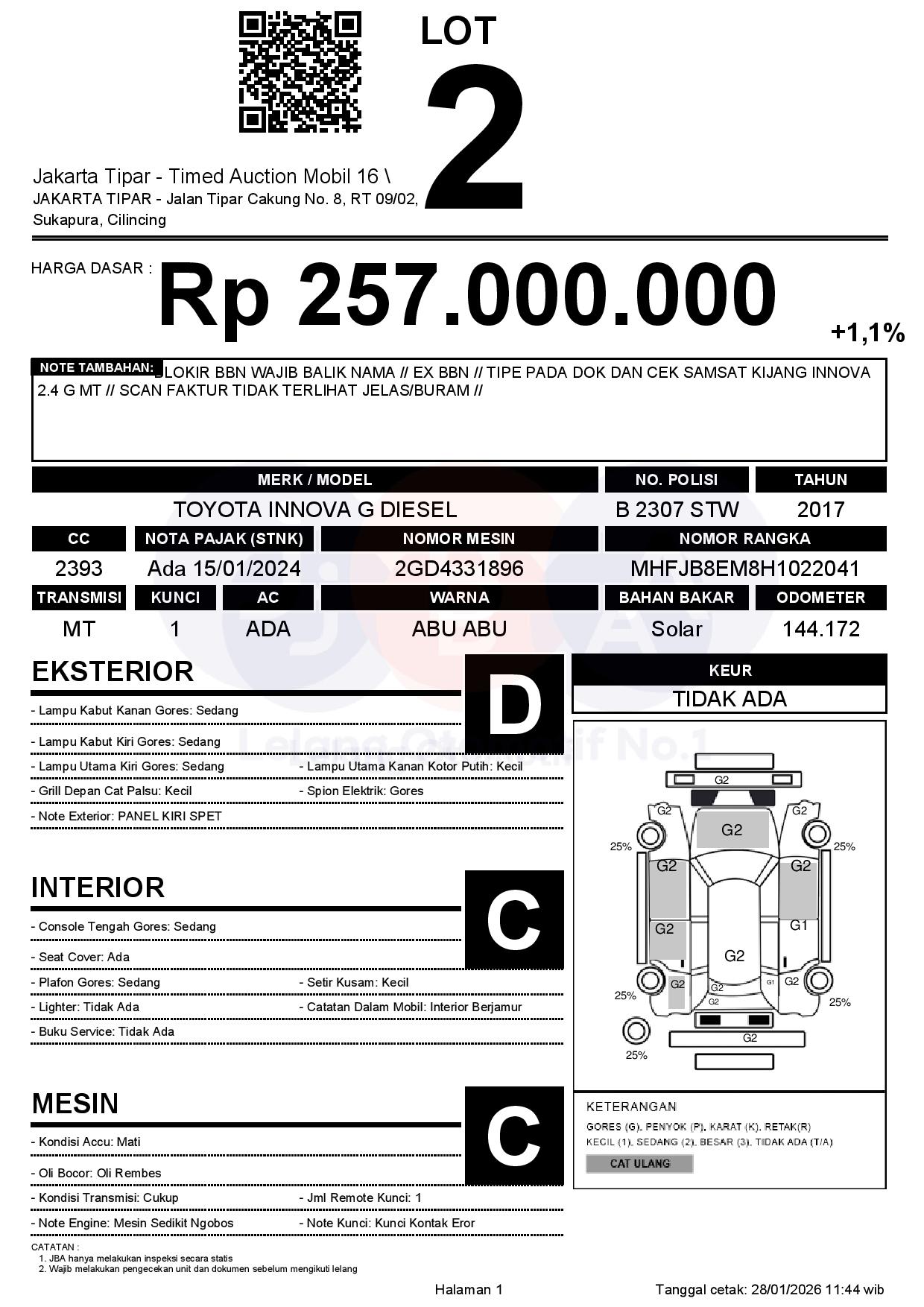 - Kondisi objek lelang dilelang apa adanya, baik kondisi fisik, mesin maupun legalitas kendaraan. Jika terdapat kekurangan/cacat baik yang terlihat maupun yang tidak terlihat, maka semua akan menjadi tanggung jawab/risiko Pemenang Lelang. Oleh karena itu, Pemenang Lelang melepaskan segala hak untuk menuntut dan/atau meminta ganti rugi atas hal tersebut kepada JBA.