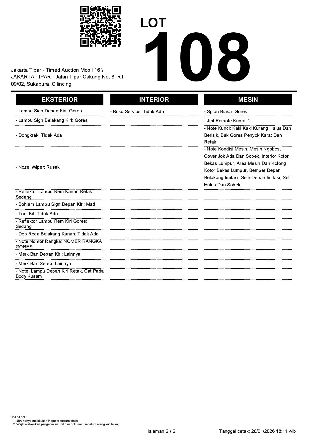 - Kondisi objek lelang dilelang apa adanya, baik kondisi fisik, mesin maupun legalitas kendaraan. Jika terdapat kekurangan/cacat baik yang terlihat maupun yang tidak terlihat, maka semua akan menjadi tanggung jawab/risiko Pemenang Lelang. Oleh karena itu, Pemenang Lelang melepaskan segala hak untuk menuntut dan/atau meminta ganti rugi atas hal tersebut kepada JBA.