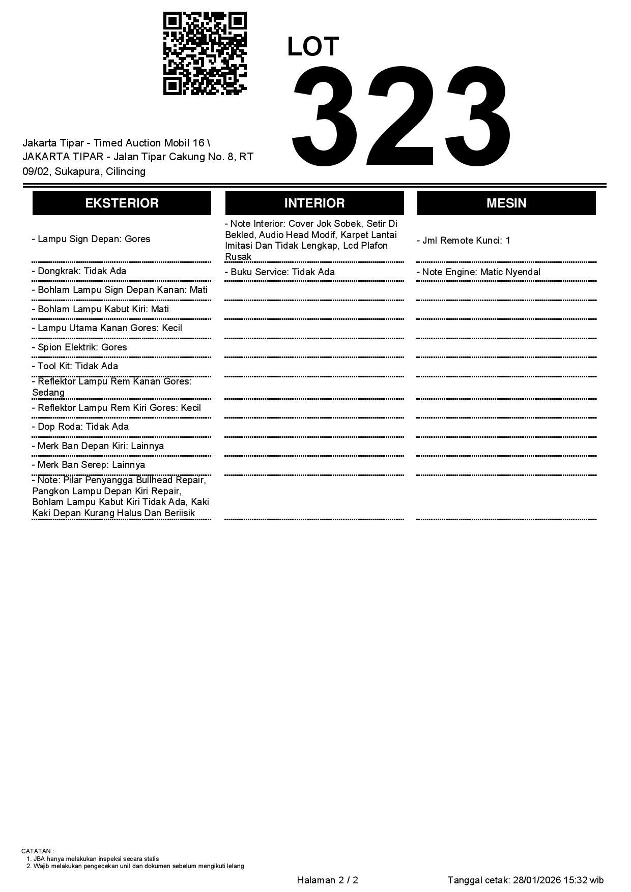 - Kondisi objek lelang dilelang apa adanya, baik kondisi fisik, mesin maupun legalitas kendaraan. Jika terdapat kekurangan/cacat baik yang terlihat maupun yang tidak terlihat, maka semua akan menjadi tanggung jawab/risiko Pemenang Lelang. Oleh karena itu, Pemenang Lelang melepaskan segala hak untuk menuntut dan/atau meminta ganti rugi atas hal tersebut kepada JBA.