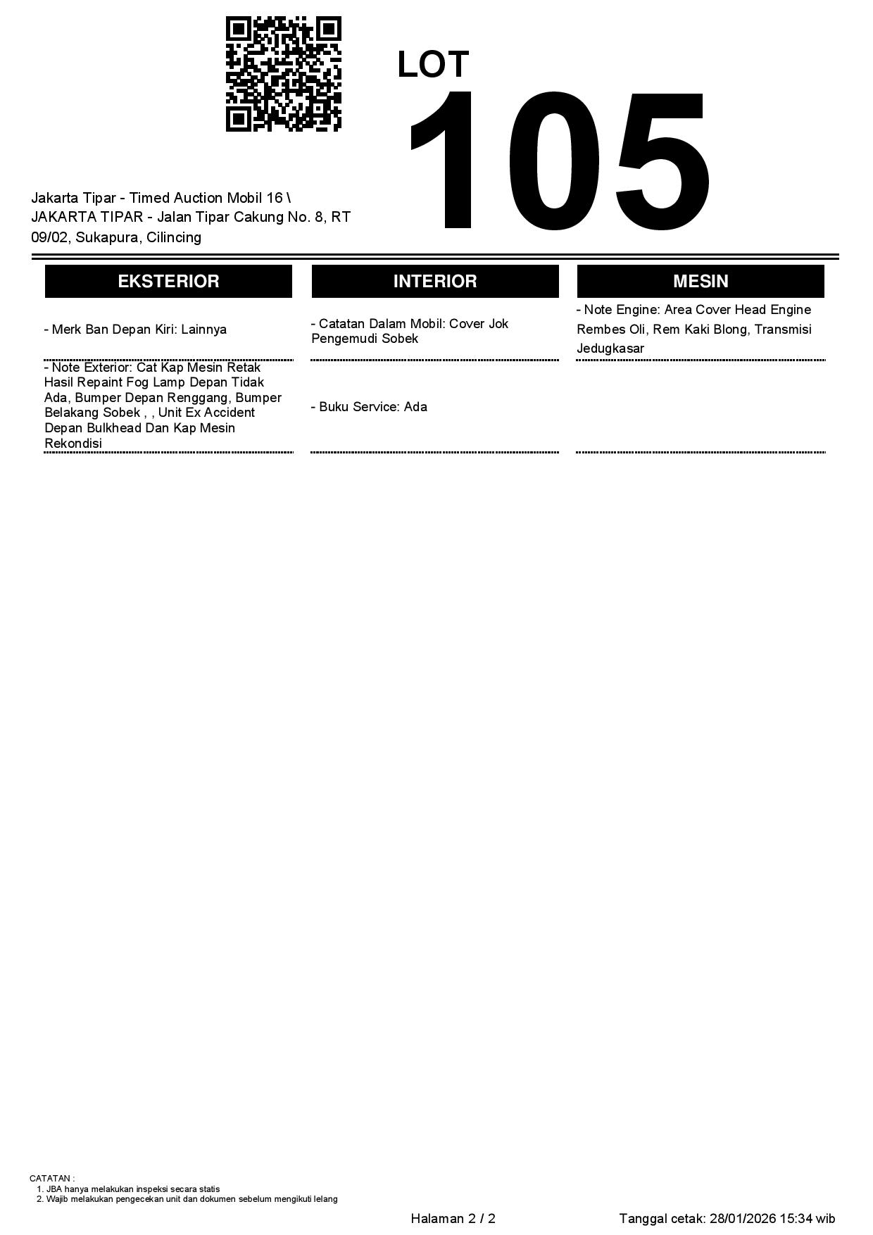 - Kondisi objek lelang dilelang apa adanya, baik kondisi fisik, mesin maupun legalitas kendaraan. Jika terdapat kekurangan/cacat baik yang terlihat maupun yang tidak terlihat, maka semua akan menjadi tanggung jawab/risiko Pemenang Lelang. Oleh karena itu, Pemenang Lelang melepaskan segala hak untuk menuntut dan/atau meminta ganti rugi atas hal tersebut kepada JBA.