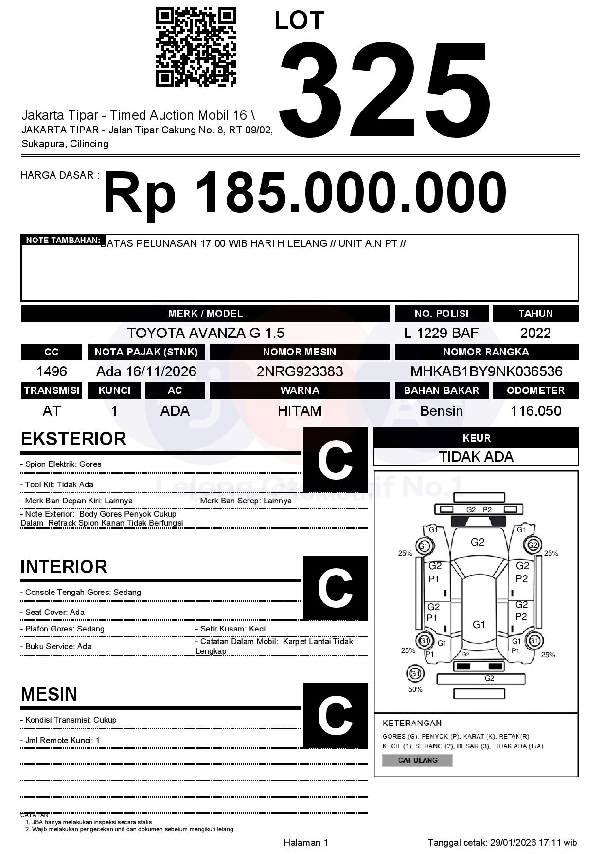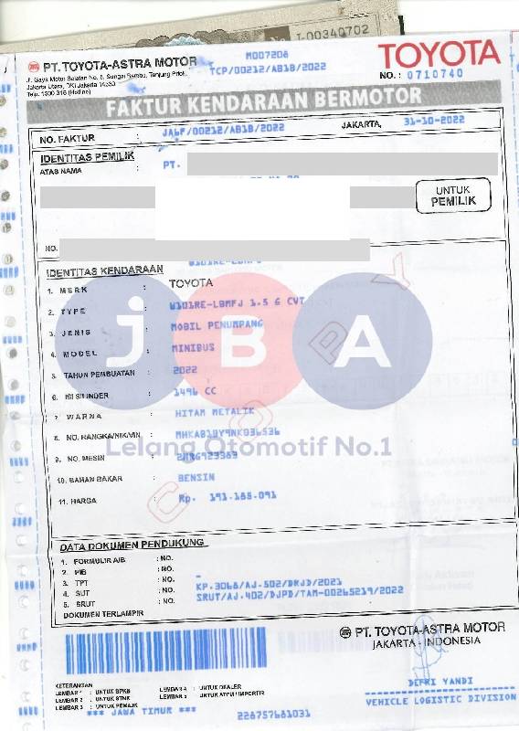 - Kondisi objek lelang dilelang apa adanya, baik kondisi fisik, mesin maupun legalitas kendaraan. Jika terdapat kekurangan/cacat baik yang terlihat maupun yang tidak terlihat, maka semua akan menjadi tanggung jawab/risiko Pemenang Lelang. Oleh karena itu, Pemenang Lelang melepaskan segala hak untuk menuntut dan/atau meminta ganti rugi atas hal tersebut kepada JBA.