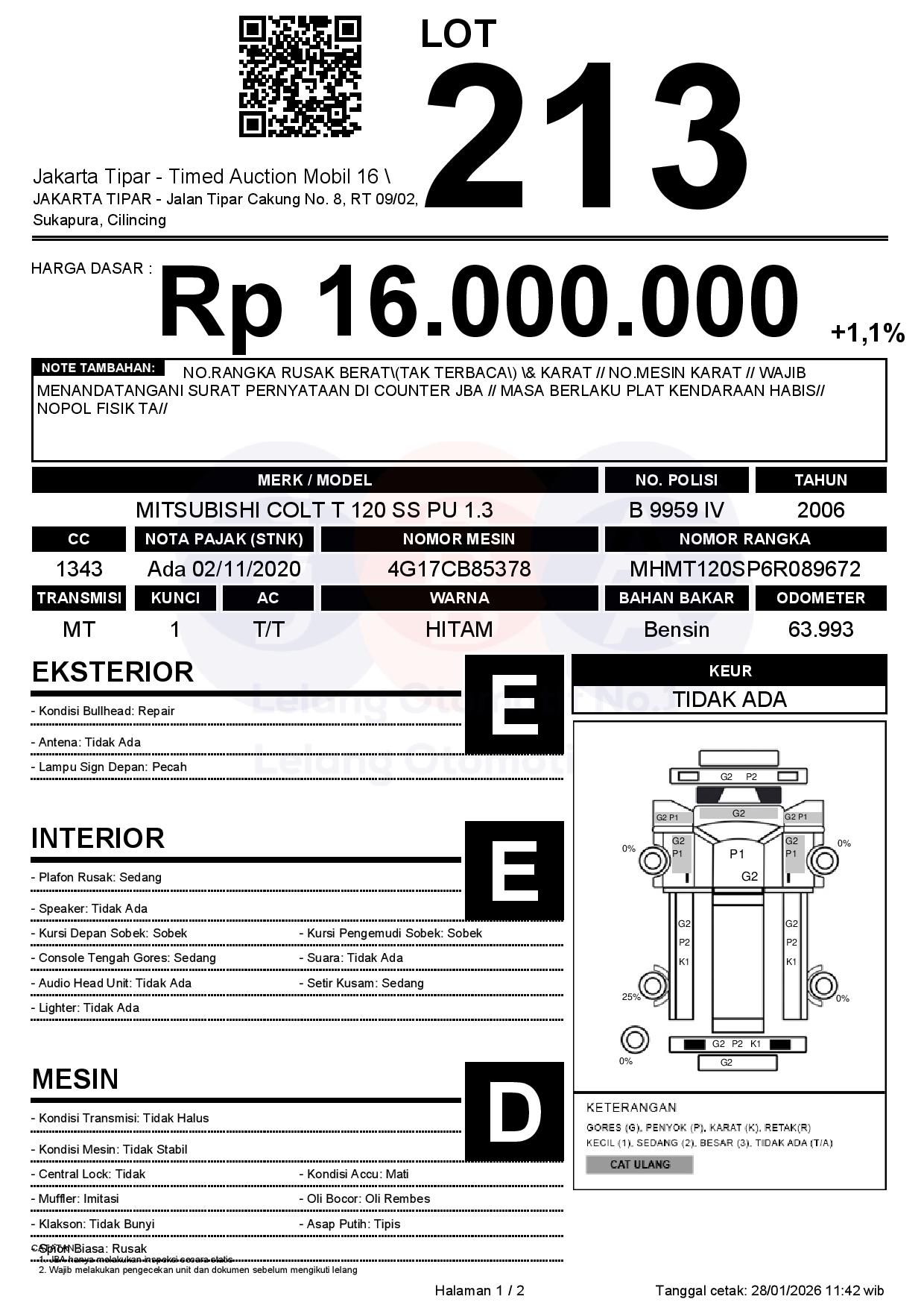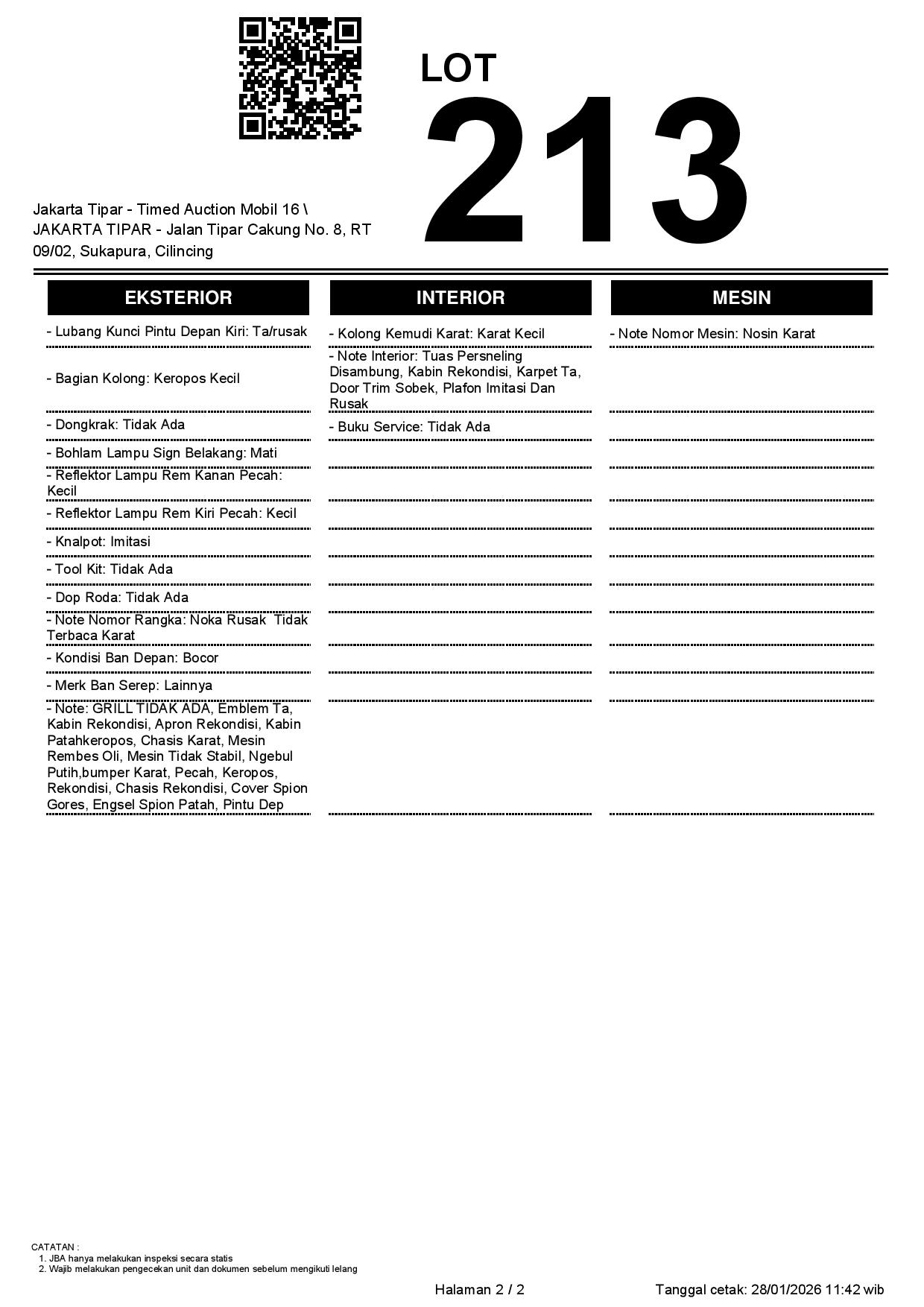 - Kondisi objek lelang dilelang apa adanya, baik kondisi fisik, mesin maupun legalitas kendaraan. Jika terdapat kekurangan/cacat baik yang terlihat maupun yang tidak terlihat, maka semua akan menjadi tanggung jawab/risiko Pemenang Lelang. Oleh karena itu, Pemenang Lelang melepaskan segala hak untuk menuntut dan/atau meminta ganti rugi atas hal tersebut kepada JBA.