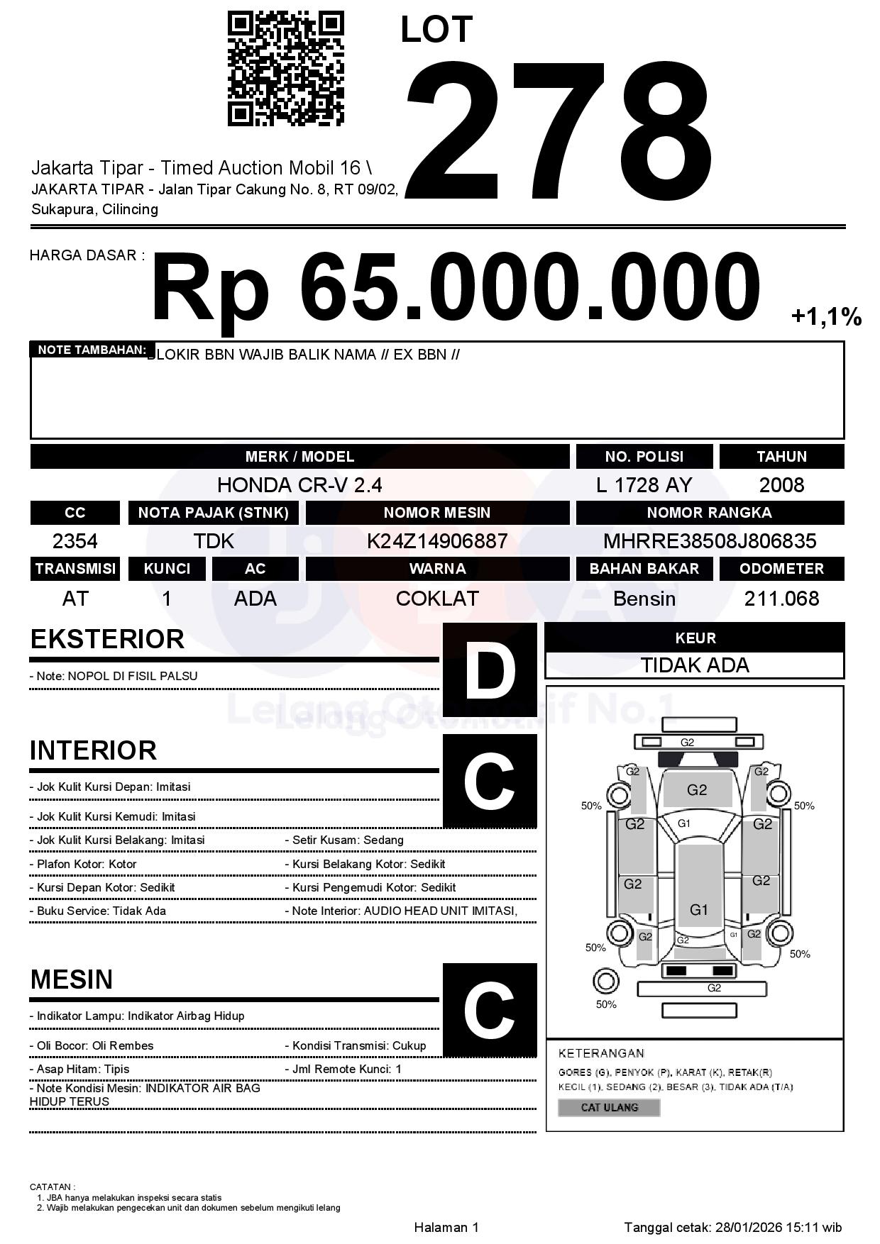 - Kondisi objek lelang dilelang apa adanya, baik kondisi fisik, mesin maupun legalitas kendaraan. Jika terdapat kekurangan/cacat baik yang terlihat maupun yang tidak terlihat, maka semua akan menjadi tanggung jawab/risiko Pemenang Lelang. Oleh karena itu, Pemenang Lelang melepaskan segala hak untuk menuntut dan/atau meminta ganti rugi atas hal tersebut kepada JBA.