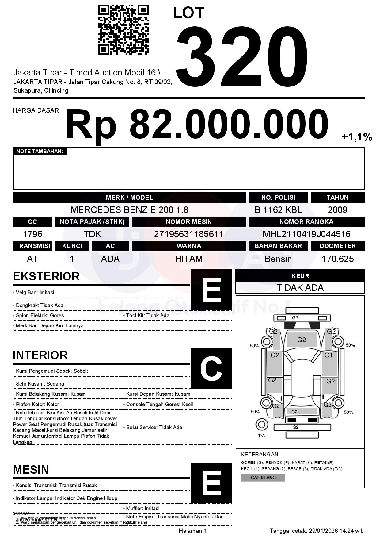 - Kondisi objek lelang dilelang apa adanya, baik kondisi fisik, mesin maupun legalitas kendaraan. Jika terdapat kekurangan/cacat baik yang terlihat maupun yang tidak terlihat, maka semua akan menjadi tanggung jawab/risiko Pemenang Lelang. Oleh karena itu, Pemenang Lelang melepaskan segala hak untuk menuntut dan/atau meminta ganti rugi atas hal tersebut kepada JBA.