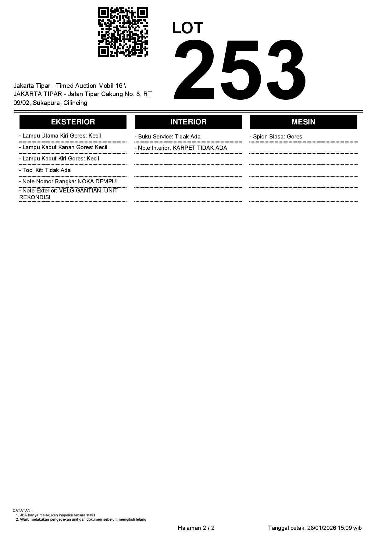 - Kondisi objek lelang dilelang apa adanya, baik kondisi fisik, mesin maupun legalitas kendaraan. Jika terdapat kekurangan/cacat baik yang terlihat maupun yang tidak terlihat, maka semua akan menjadi tanggung jawab/risiko Pemenang Lelang. Oleh karena itu, Pemenang Lelang melepaskan segala hak untuk menuntut dan/atau meminta ganti rugi atas hal tersebut kepada JBA.