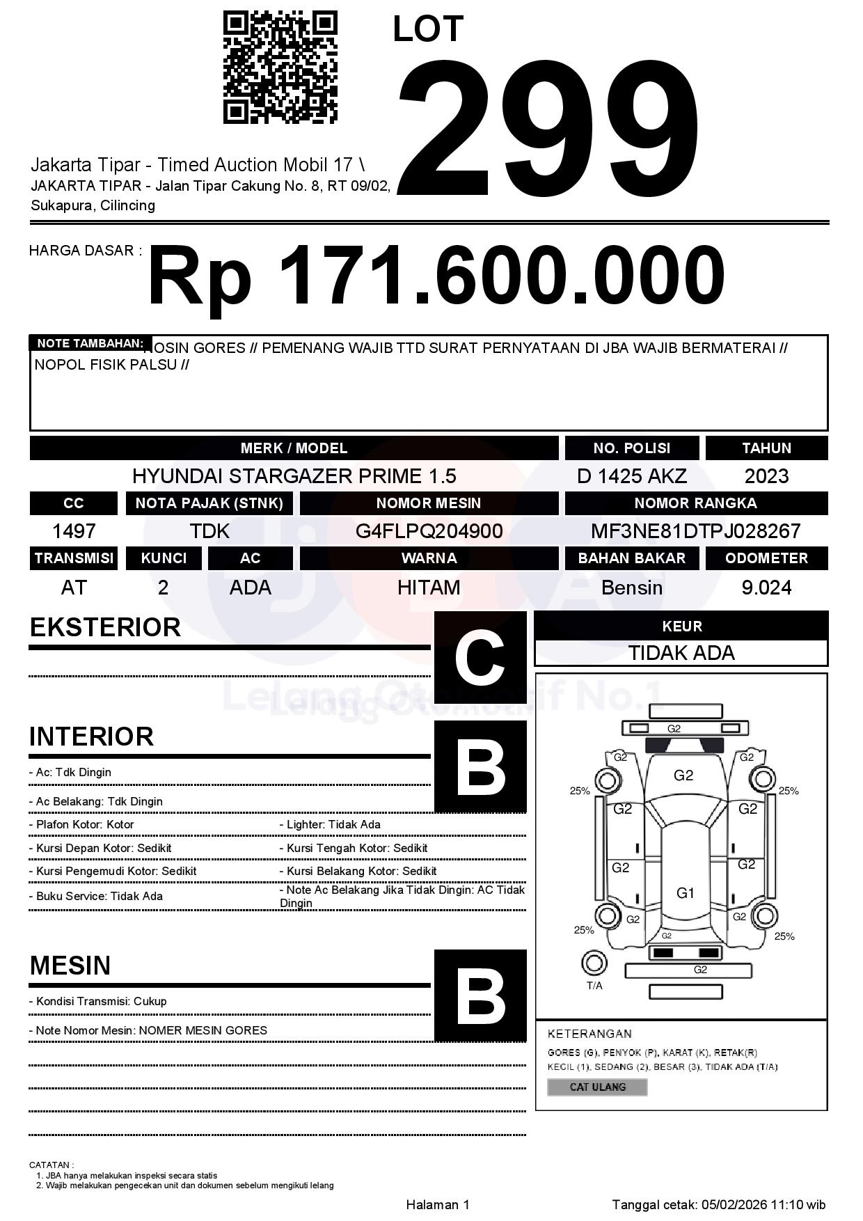 - Kondisi objek lelang dilelang apa adanya, baik kondisi fisik, mesin maupun legalitas kendaraan. Jika terdapat kekurangan/cacat baik yang terlihat maupun yang tidak terlihat, maka semua akan menjadi tanggung jawab/risiko Pemenang Lelang. Oleh karena itu, Pemenang Lelang melepaskan segala hak untuk menuntut dan/atau meminta ganti rugi atas hal tersebut kepada JBA.