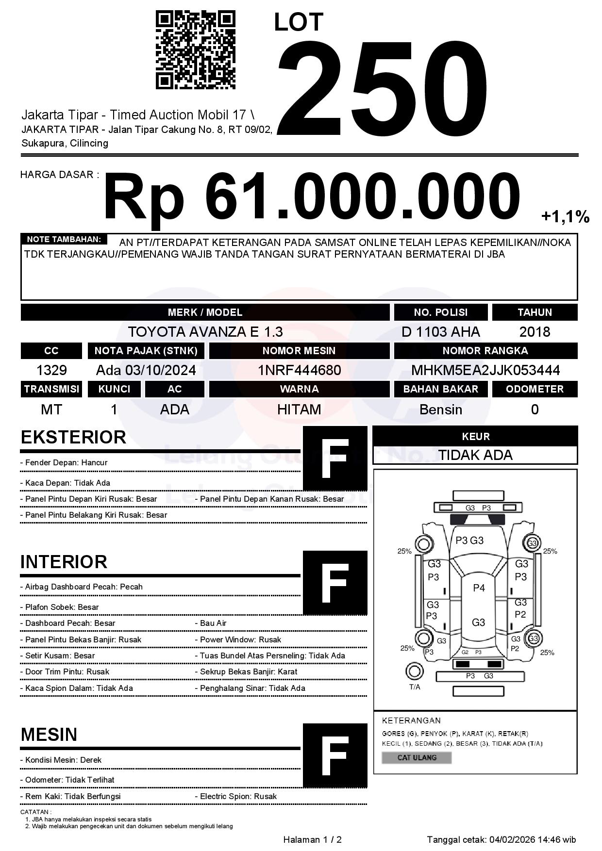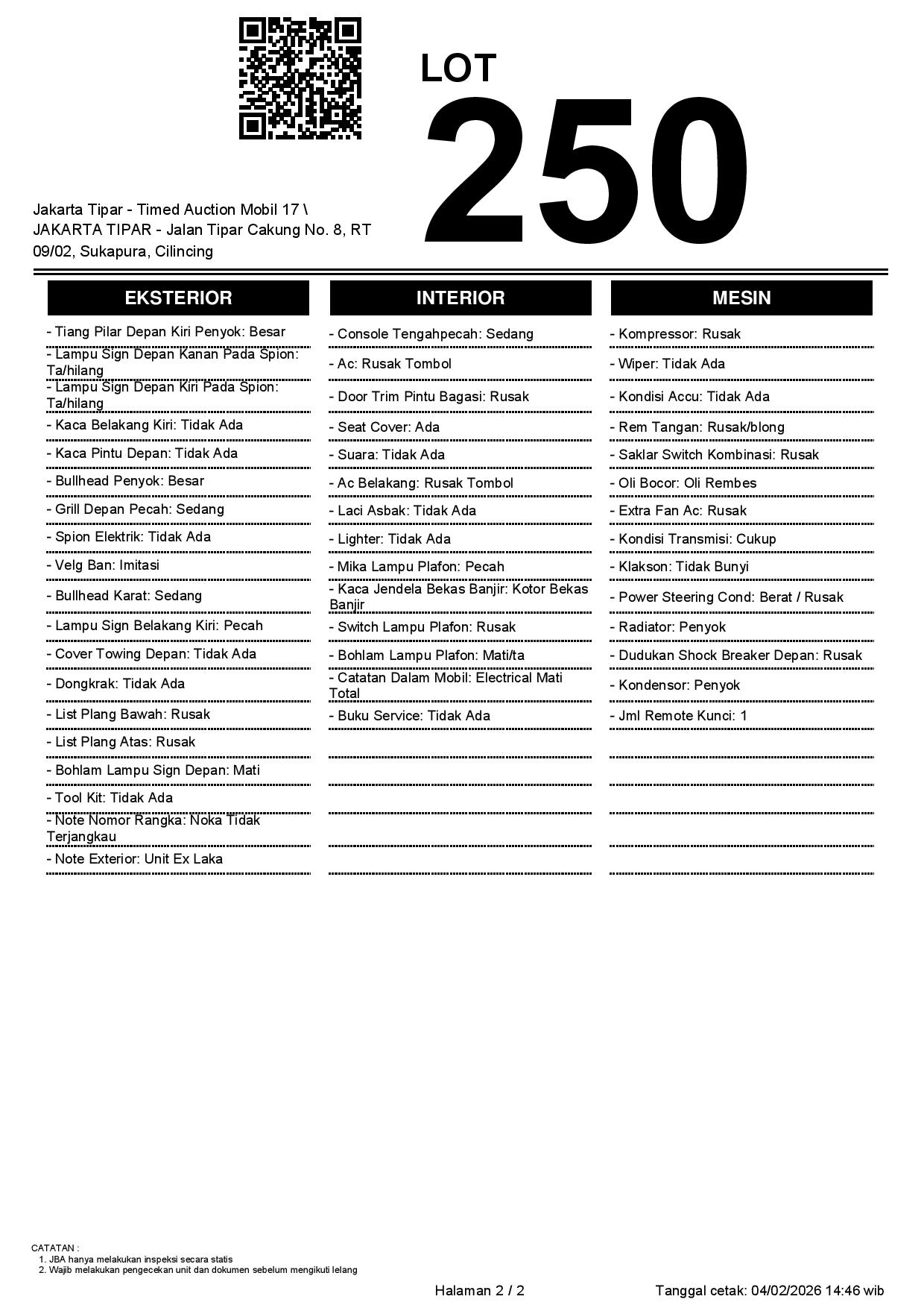 - Kondisi objek lelang dilelang apa adanya, baik kondisi fisik, mesin maupun legalitas kendaraan. Jika terdapat kekurangan/cacat baik yang terlihat maupun yang tidak terlihat, maka semua akan menjadi tanggung jawab/risiko Pemenang Lelang. Oleh karena itu, Pemenang Lelang melepaskan segala hak untuk menuntut dan/atau meminta ganti rugi atas hal tersebut kepada JBA.