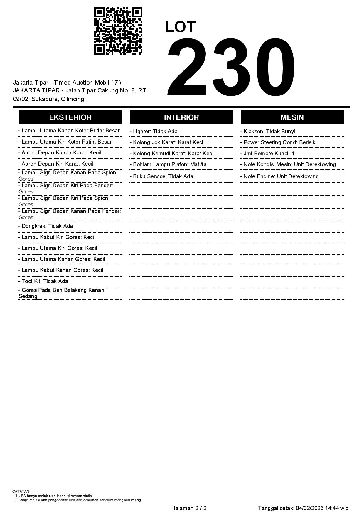 - Kondisi objek lelang dilelang apa adanya, baik kondisi fisik, mesin maupun legalitas kendaraan. Jika terdapat kekurangan/cacat baik yang terlihat maupun yang tidak terlihat, maka semua akan menjadi tanggung jawab/risiko Pemenang Lelang. Oleh karena itu, Pemenang Lelang melepaskan segala hak untuk menuntut dan/atau meminta ganti rugi atas hal tersebut kepada JBA.