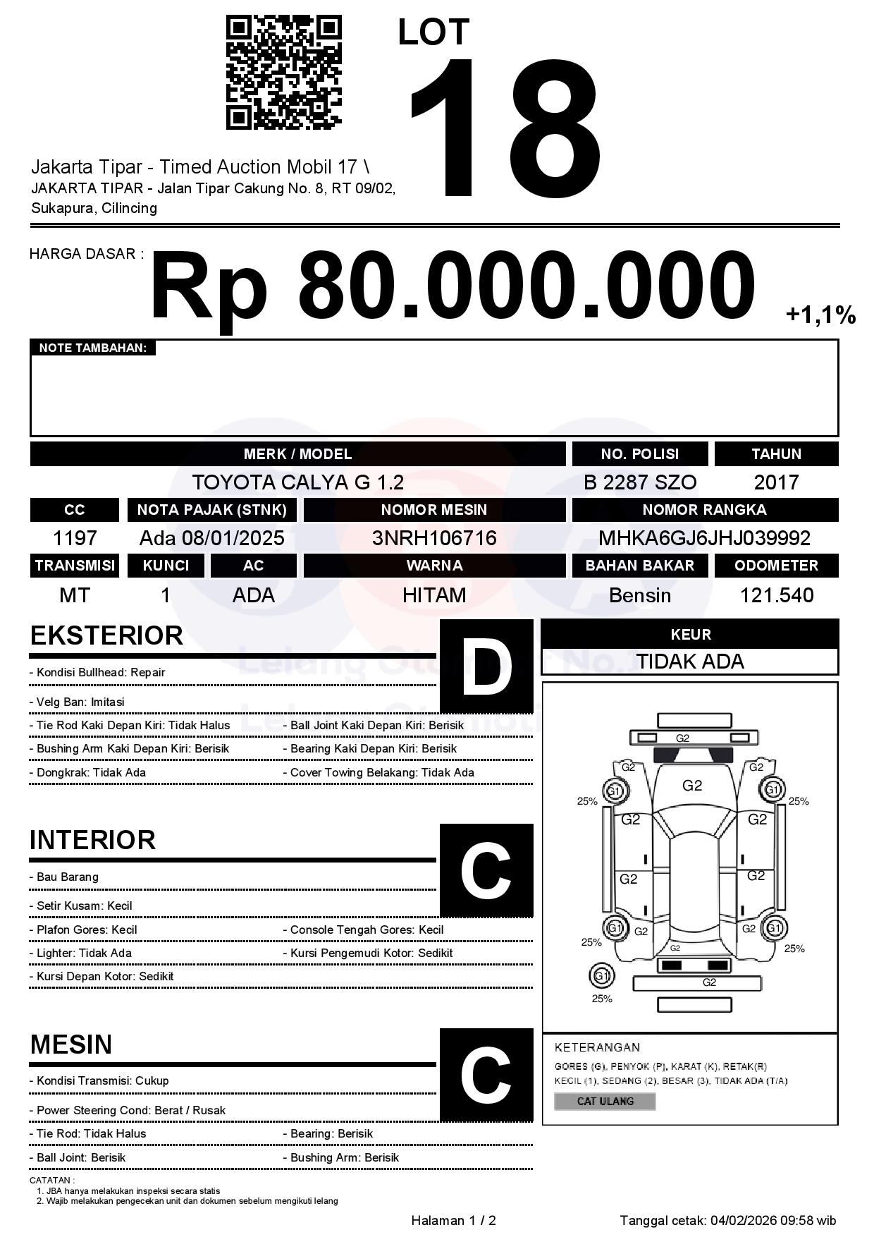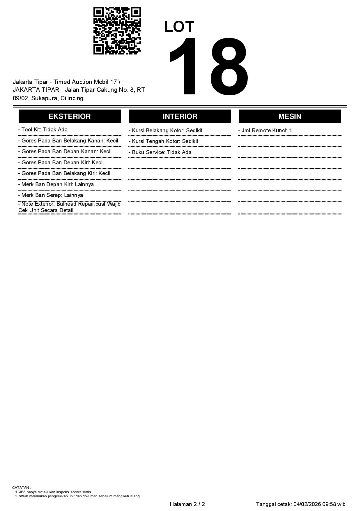 - Kondisi objek lelang dilelang apa adanya, baik kondisi fisik, mesin maupun legalitas kendaraan. Jika terdapat kekurangan/cacat baik yang terlihat maupun yang tidak terlihat, maka semua akan menjadi tanggung jawab/risiko Pemenang Lelang. Oleh karena itu, Pemenang Lelang melepaskan segala hak untuk menuntut dan/atau meminta ganti rugi atas hal tersebut kepada JBA.