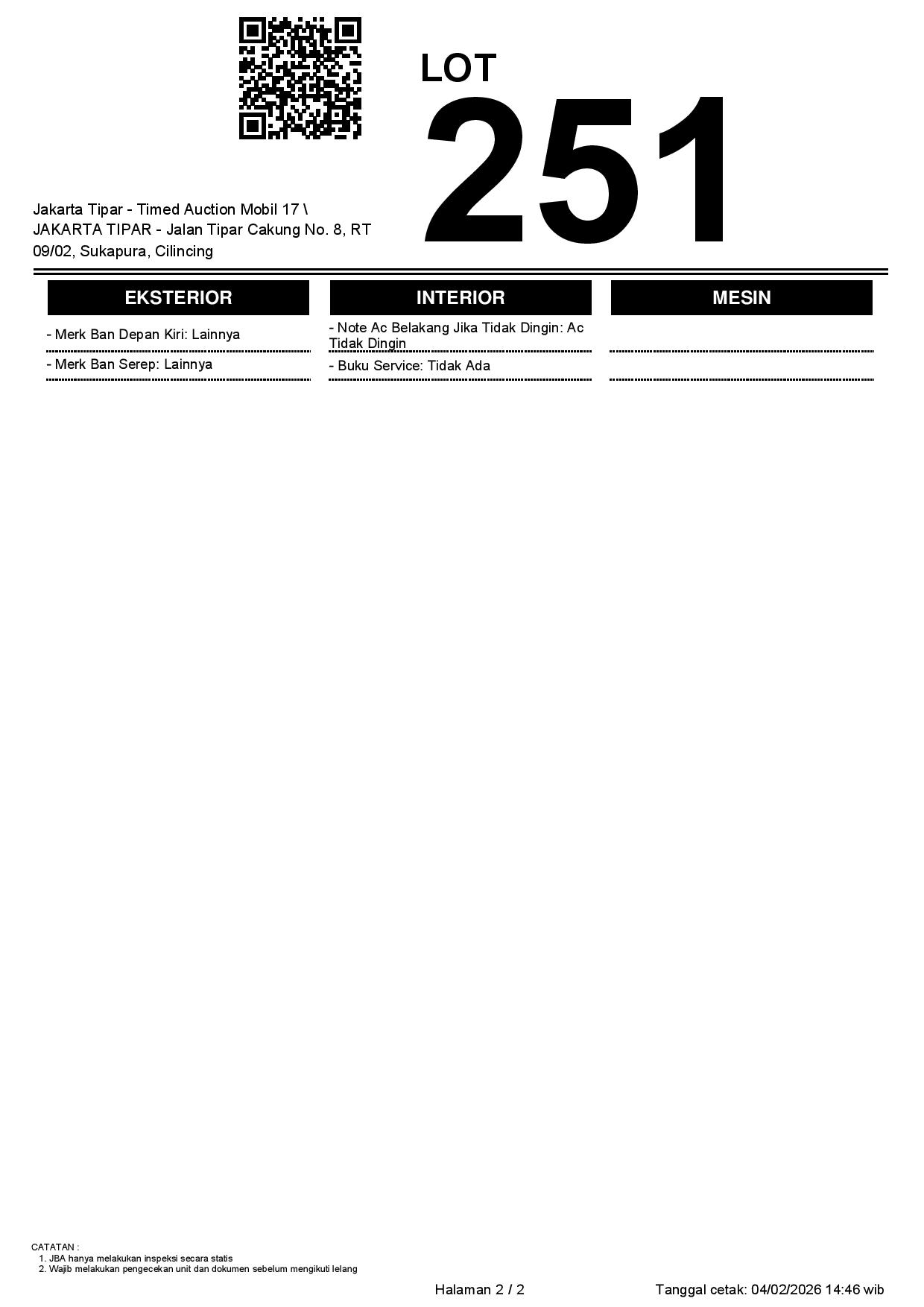 - Kondisi objek lelang dilelang apa adanya, baik kondisi fisik, mesin maupun legalitas kendaraan. Jika terdapat kekurangan/cacat baik yang terlihat maupun yang tidak terlihat, maka semua akan menjadi tanggung jawab/risiko Pemenang Lelang. Oleh karena itu, Pemenang Lelang melepaskan segala hak untuk menuntut dan/atau meminta ganti rugi atas hal tersebut kepada JBA.