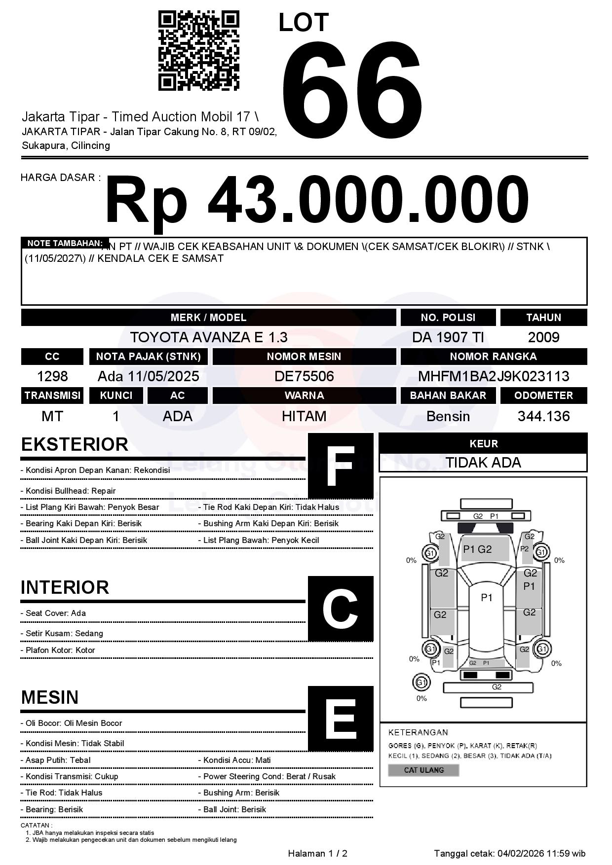 - Kondisi objek lelang dilelang apa adanya, baik kondisi fisik, mesin maupun legalitas kendaraan. Jika terdapat kekurangan/cacat baik yang terlihat maupun yang tidak terlihat, maka semua akan menjadi tanggung jawab/risiko Pemenang Lelang. Oleh karena itu, Pemenang Lelang melepaskan segala hak untuk menuntut dan/atau meminta ganti rugi atas hal tersebut kepada JBA.