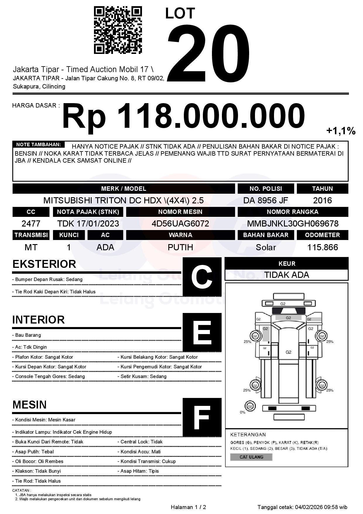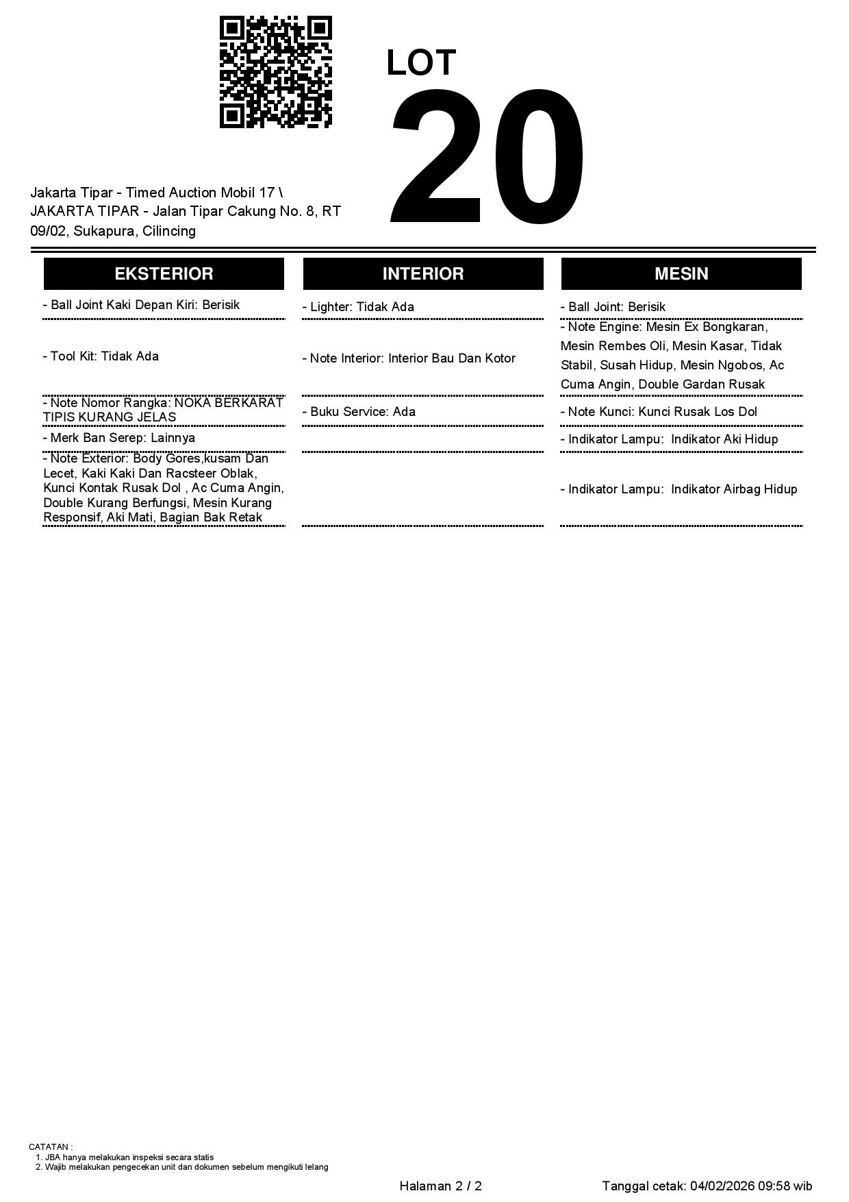 - Kondisi objek lelang dilelang apa adanya, baik kondisi fisik, mesin maupun legalitas kendaraan. Jika terdapat kekurangan/cacat baik yang terlihat maupun yang tidak terlihat, maka semua akan menjadi tanggung jawab/risiko Pemenang Lelang. Oleh karena itu, Pemenang Lelang melepaskan segala hak untuk menuntut dan/atau meminta ganti rugi atas hal tersebut kepada JBA.