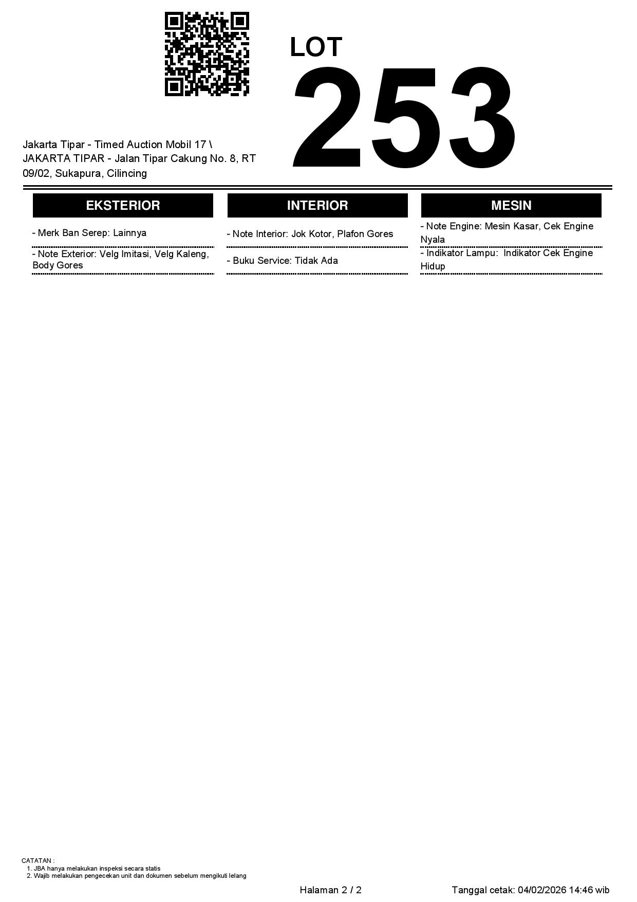 - Kondisi objek lelang dilelang apa adanya, baik kondisi fisik, mesin maupun legalitas kendaraan. Jika terdapat kekurangan/cacat baik yang terlihat maupun yang tidak terlihat, maka semua akan menjadi tanggung jawab/risiko Pemenang Lelang. Oleh karena itu, Pemenang Lelang melepaskan segala hak untuk menuntut dan/atau meminta ganti rugi atas hal tersebut kepada JBA.