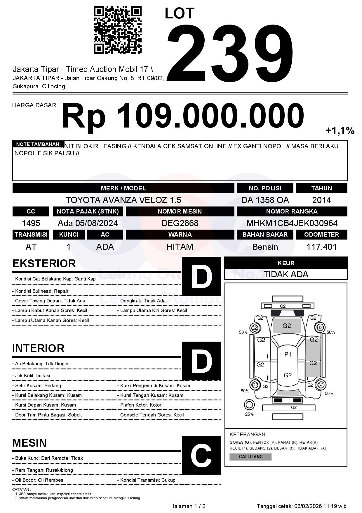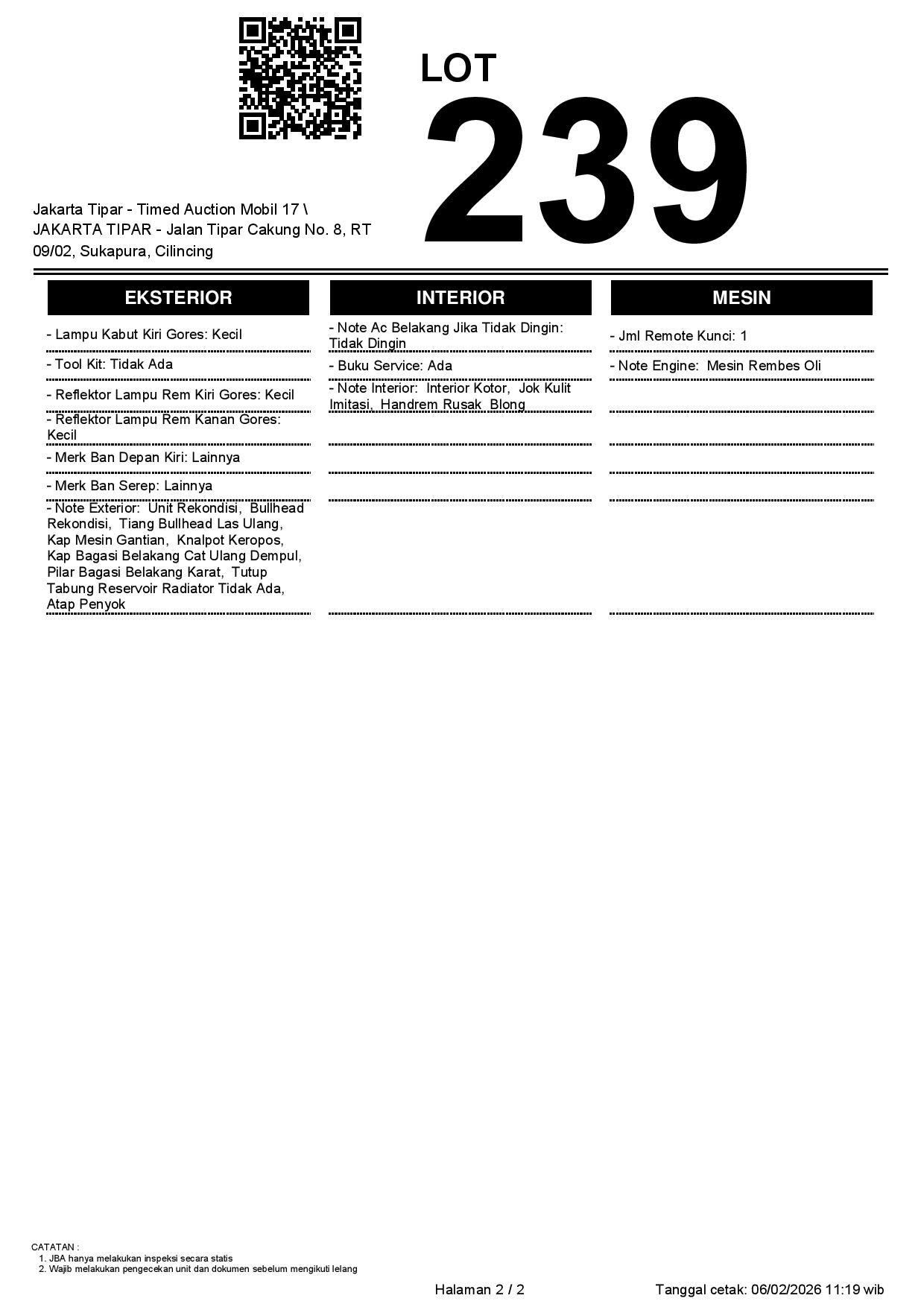 - Kondisi objek lelang dilelang apa adanya, baik kondisi fisik, mesin maupun legalitas kendaraan. Jika terdapat kekurangan/cacat baik yang terlihat maupun yang tidak terlihat, maka semua akan menjadi tanggung jawab/risiko Pemenang Lelang. Oleh karena itu, Pemenang Lelang melepaskan segala hak untuk menuntut dan/atau meminta ganti rugi atas hal tersebut kepada JBA.
