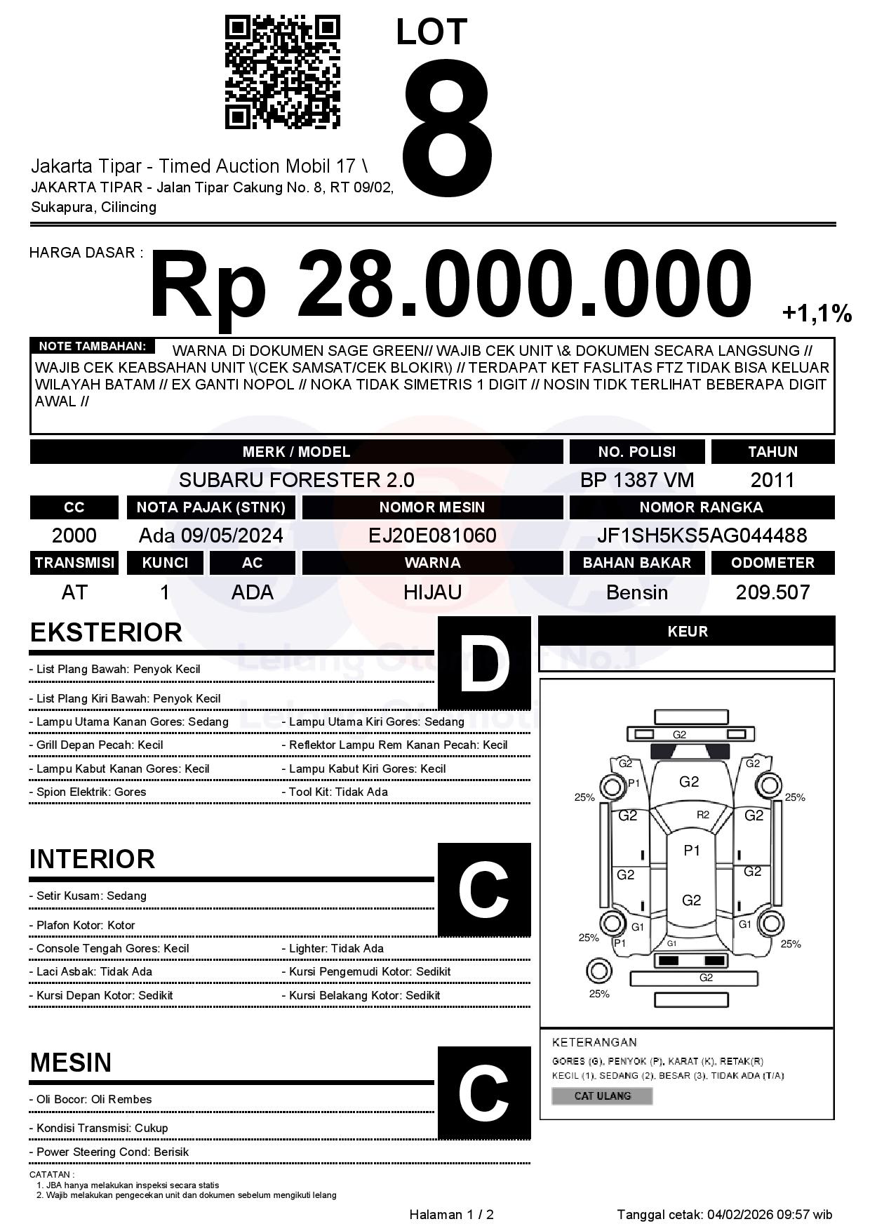 - Kondisi objek lelang dilelang apa adanya, baik kondisi fisik, mesin maupun legalitas kendaraan. Jika terdapat kekurangan/cacat baik yang terlihat maupun yang tidak terlihat, maka semua akan menjadi tanggung jawab/risiko Pemenang Lelang. Oleh karena itu, Pemenang Lelang melepaskan segala hak untuk menuntut dan/atau meminta ganti rugi atas hal tersebut kepada JBA.