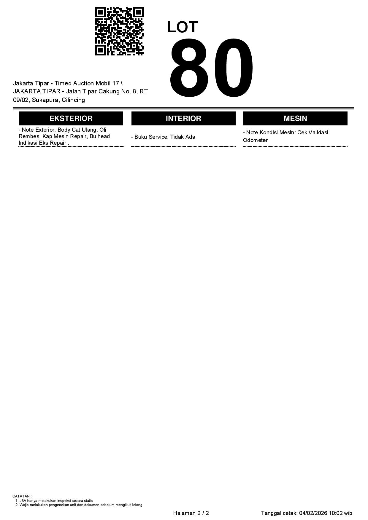 - Kondisi objek lelang dilelang apa adanya, baik kondisi fisik, mesin maupun legalitas kendaraan. Jika terdapat kekurangan/cacat baik yang terlihat maupun yang tidak terlihat, maka semua akan menjadi tanggung jawab/risiko Pemenang Lelang. Oleh karena itu, Pemenang Lelang melepaskan segala hak untuk menuntut dan/atau meminta ganti rugi atas hal tersebut kepada JBA.