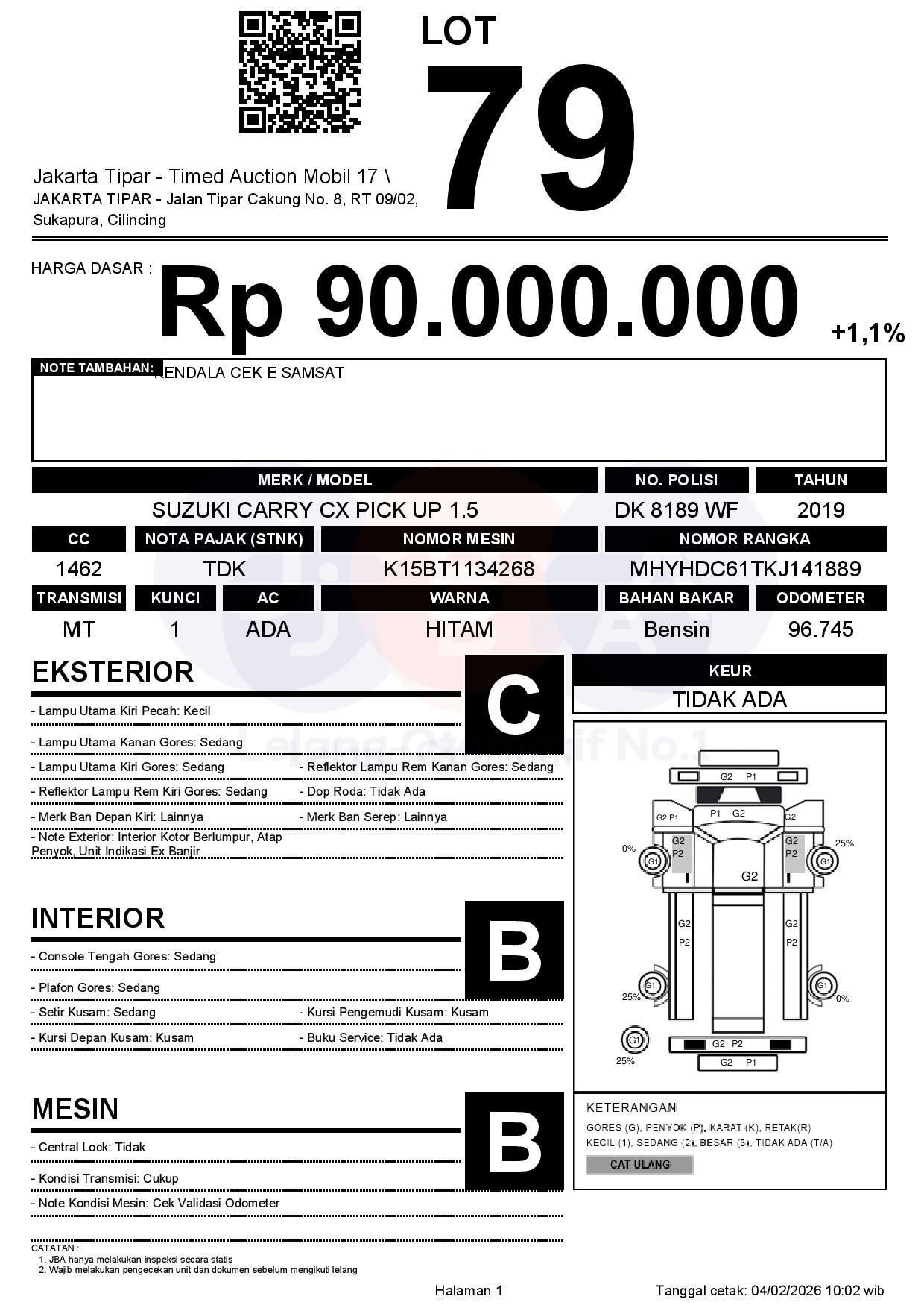 - Kondisi objek lelang dilelang apa adanya, baik kondisi fisik, mesin maupun legalitas kendaraan. Jika terdapat kekurangan/cacat baik yang terlihat maupun yang tidak terlihat, maka semua akan menjadi tanggung jawab/risiko Pemenang Lelang. Oleh karena itu, Pemenang Lelang melepaskan segala hak untuk menuntut dan/atau meminta ganti rugi atas hal tersebut kepada JBA.