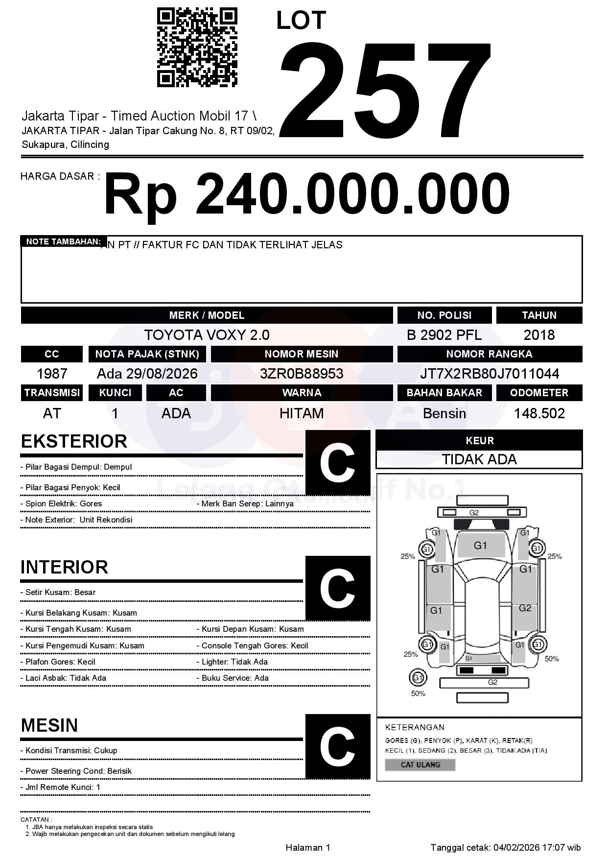 - Kondisi objek lelang dilelang apa adanya, baik kondisi fisik, mesin maupun legalitas kendaraan. Jika terdapat kekurangan/cacat baik yang terlihat maupun yang tidak terlihat, maka semua akan menjadi tanggung jawab/risiko Pemenang Lelang. Oleh karena itu, Pemenang Lelang melepaskan segala hak untuk menuntut dan/atau meminta ganti rugi atas hal tersebut kepada JBA.