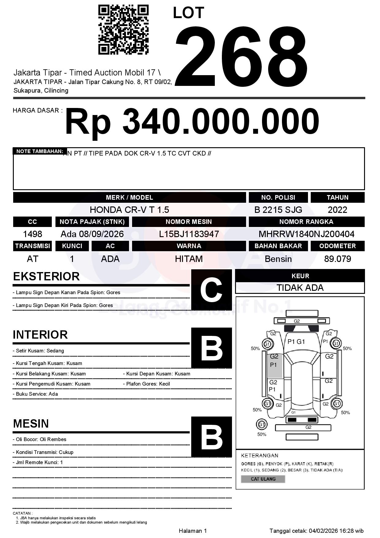 - Kondisi objek lelang dilelang apa adanya, baik kondisi fisik, mesin maupun legalitas kendaraan. Jika terdapat kekurangan/cacat baik yang terlihat maupun yang tidak terlihat, maka semua akan menjadi tanggung jawab/risiko Pemenang Lelang. Oleh karena itu, Pemenang Lelang melepaskan segala hak untuk menuntut dan/atau meminta ganti rugi atas hal tersebut kepada JBA.