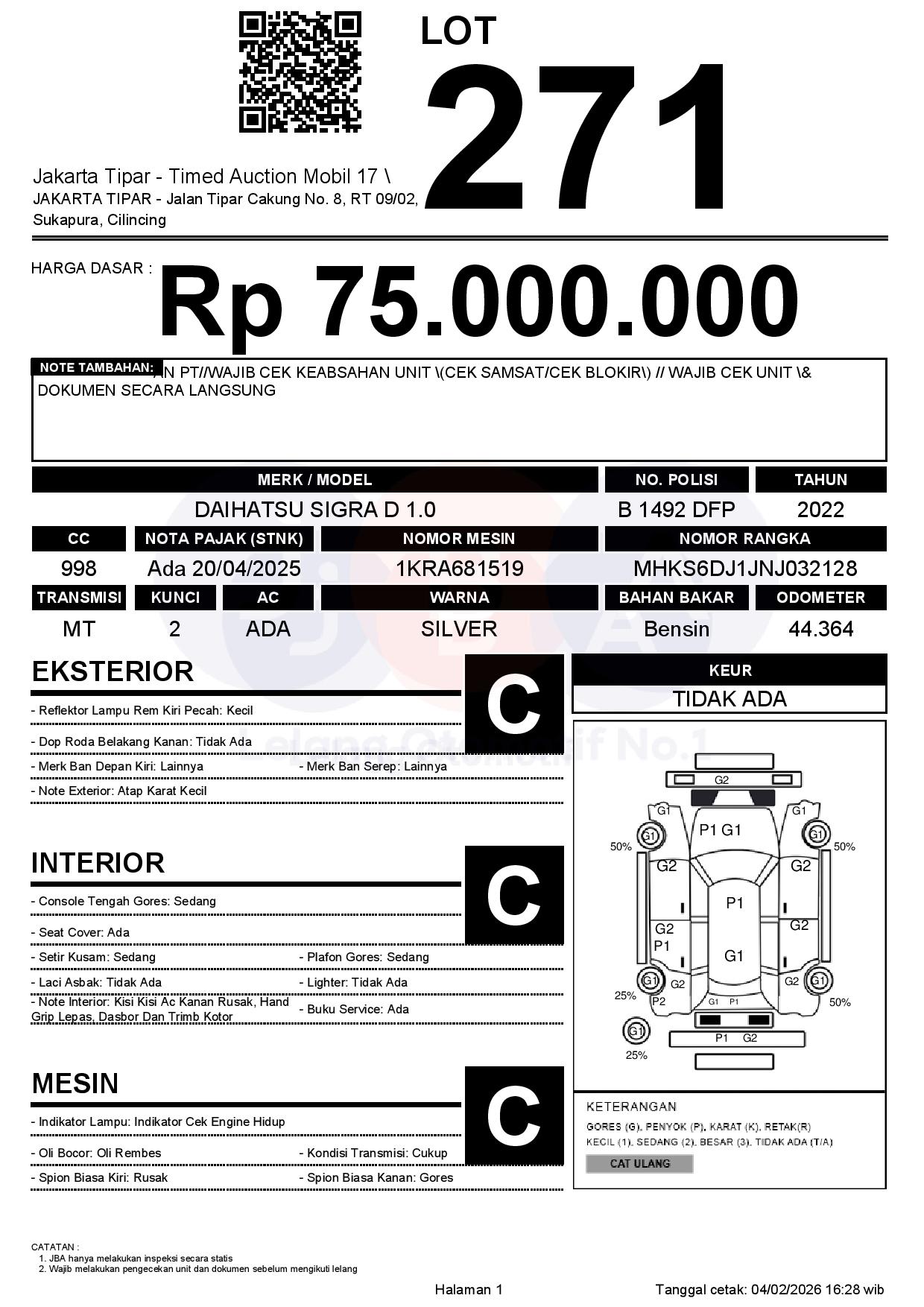 - Kondisi objek lelang dilelang apa adanya, baik kondisi fisik, mesin maupun legalitas kendaraan. Jika terdapat kekurangan/cacat baik yang terlihat maupun yang tidak terlihat, maka semua akan menjadi tanggung jawab/risiko Pemenang Lelang. Oleh karena itu, Pemenang Lelang melepaskan segala hak untuk menuntut dan/atau meminta ganti rugi atas hal tersebut kepada JBA.