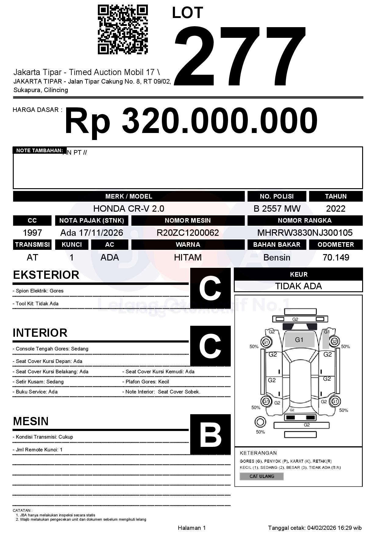 - Kondisi objek lelang dilelang apa adanya, baik kondisi fisik, mesin maupun legalitas kendaraan. Jika terdapat kekurangan/cacat baik yang terlihat maupun yang tidak terlihat, maka semua akan menjadi tanggung jawab/risiko Pemenang Lelang. Oleh karena itu, Pemenang Lelang melepaskan segala hak untuk menuntut dan/atau meminta ganti rugi atas hal tersebut kepada JBA.
