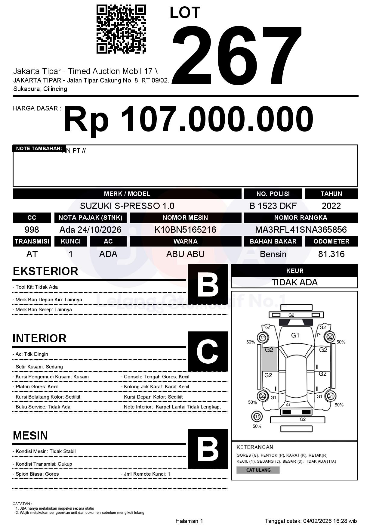 - Kondisi objek lelang dilelang apa adanya, baik kondisi fisik, mesin maupun legalitas kendaraan. Jika terdapat kekurangan/cacat baik yang terlihat maupun yang tidak terlihat, maka semua akan menjadi tanggung jawab/risiko Pemenang Lelang. Oleh karena itu, Pemenang Lelang melepaskan segala hak untuk menuntut dan/atau meminta ganti rugi atas hal tersebut kepada JBA.