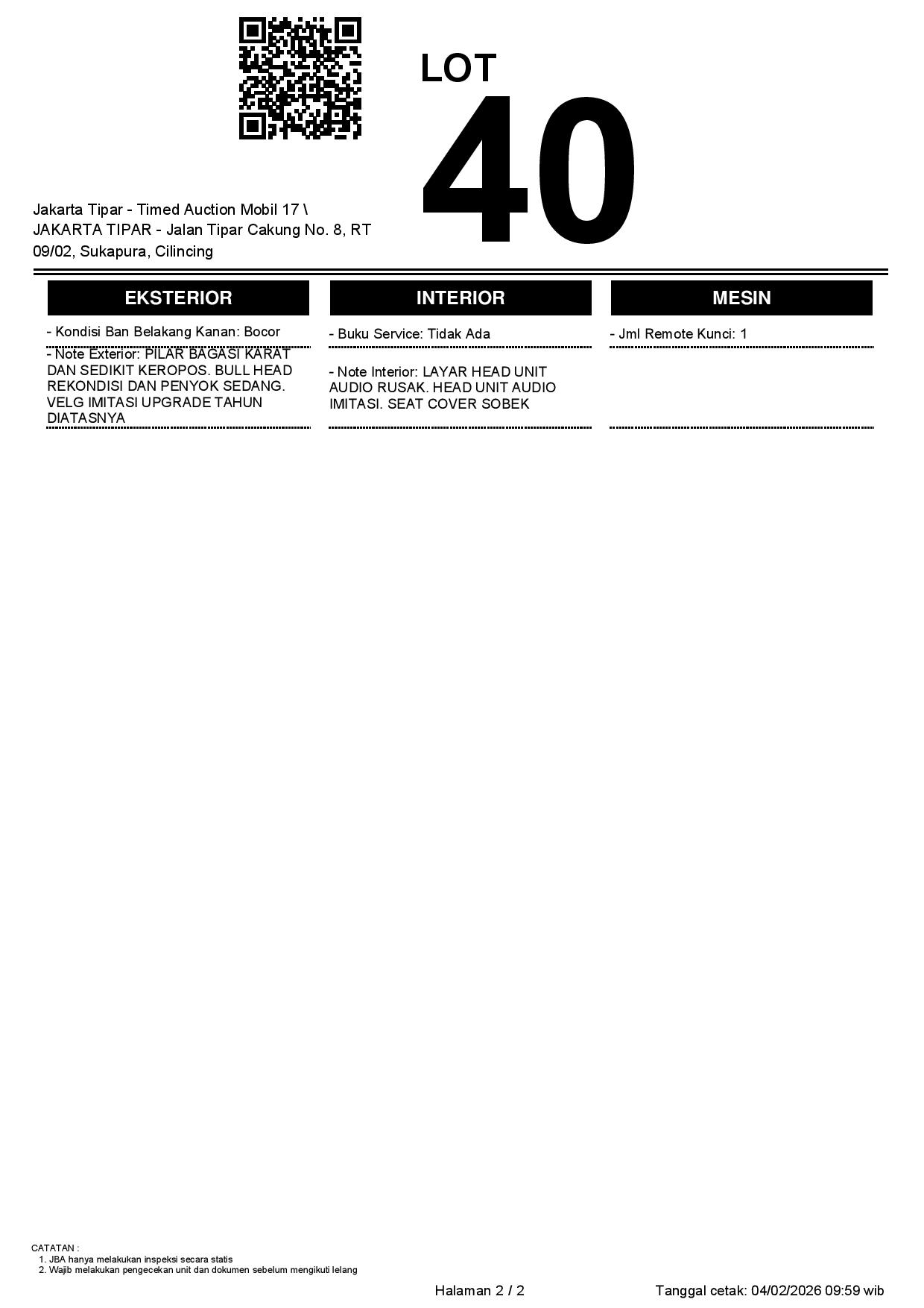 - Kondisi objek lelang dilelang apa adanya, baik kondisi fisik, mesin maupun legalitas kendaraan. Jika terdapat kekurangan/cacat baik yang terlihat maupun yang tidak terlihat, maka semua akan menjadi tanggung jawab/risiko Pemenang Lelang. Oleh karena itu, Pemenang Lelang melepaskan segala hak untuk menuntut dan/atau meminta ganti rugi atas hal tersebut kepada JBA.