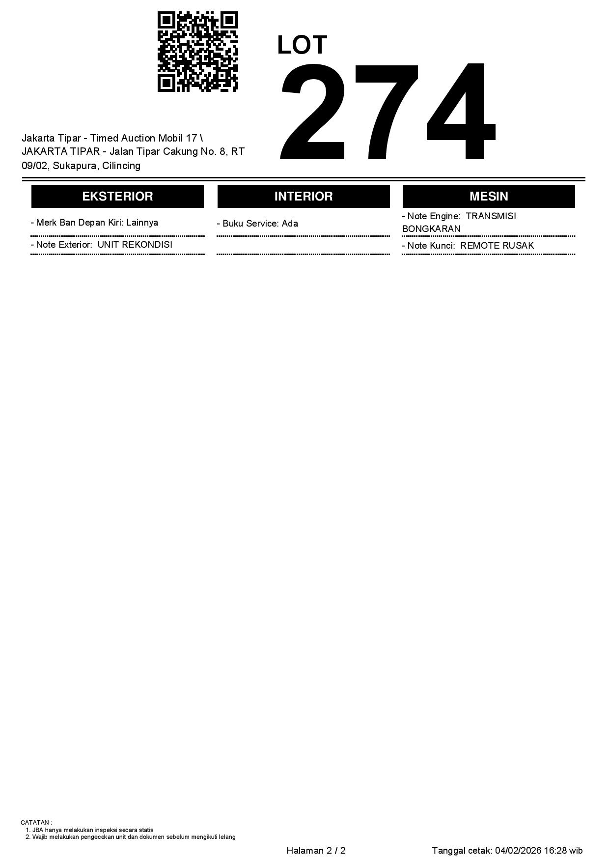 - Kondisi objek lelang dilelang apa adanya, baik kondisi fisik, mesin maupun legalitas kendaraan. Jika terdapat kekurangan/cacat baik yang terlihat maupun yang tidak terlihat, maka semua akan menjadi tanggung jawab/risiko Pemenang Lelang. Oleh karena itu, Pemenang Lelang melepaskan segala hak untuk menuntut dan/atau meminta ganti rugi atas hal tersebut kepada JBA.