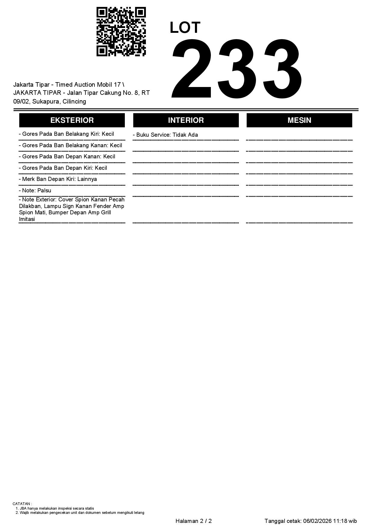 - Kondisi objek lelang dilelang apa adanya, baik kondisi fisik, mesin maupun legalitas kendaraan. Jika terdapat kekurangan/cacat baik yang terlihat maupun yang tidak terlihat, maka semua akan menjadi tanggung jawab/risiko Pemenang Lelang. Oleh karena itu, Pemenang Lelang melepaskan segala hak untuk menuntut dan/atau meminta ganti rugi atas hal tersebut kepada JBA.