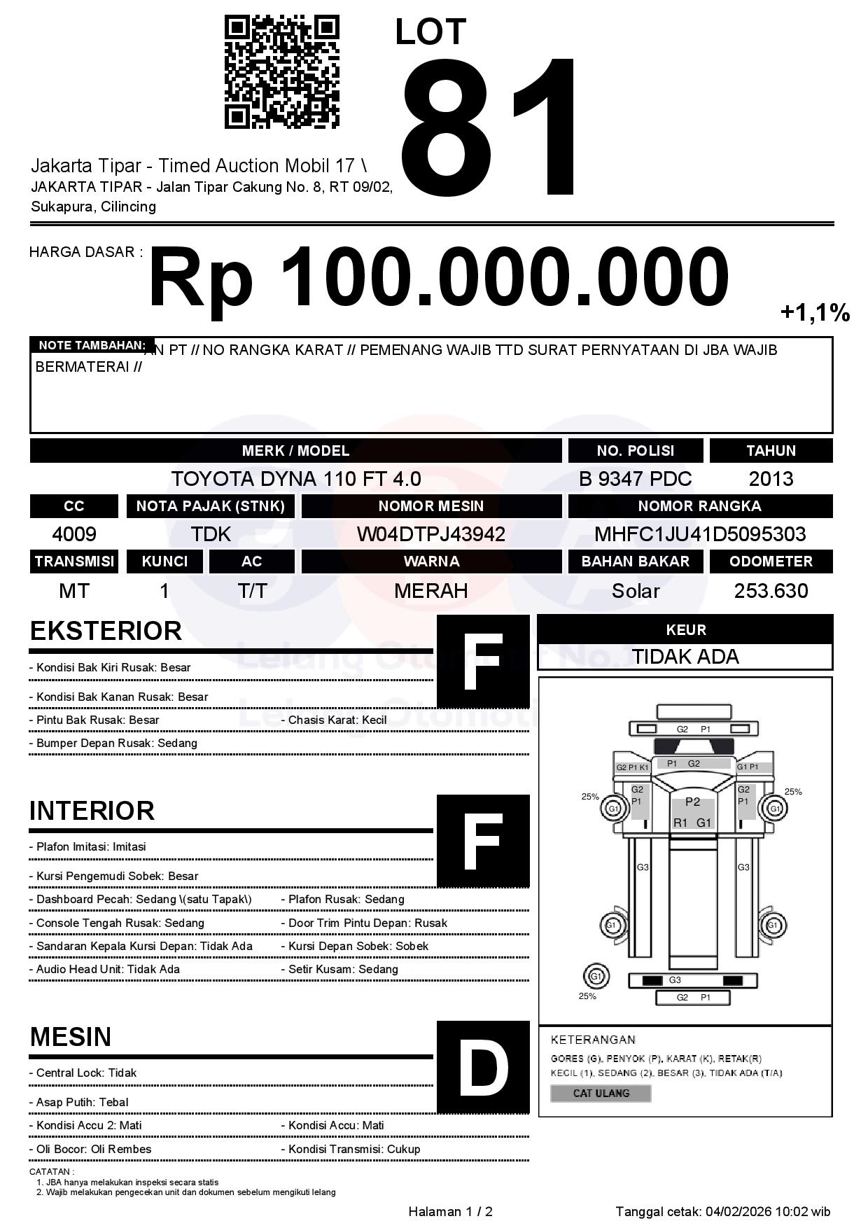 - Kondisi objek lelang dilelang apa adanya, baik kondisi fisik, mesin maupun legalitas kendaraan. Jika terdapat kekurangan/cacat baik yang terlihat maupun yang tidak terlihat, maka semua akan menjadi tanggung jawab/risiko Pemenang Lelang. Oleh karena itu, Pemenang Lelang melepaskan segala hak untuk menuntut dan/atau meminta ganti rugi atas hal tersebut kepada JBA.