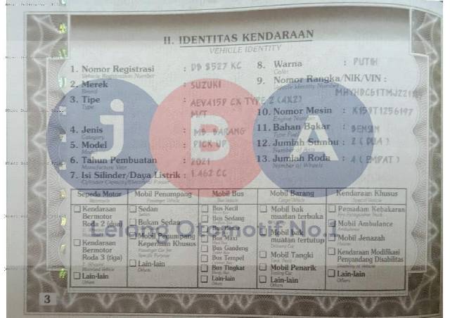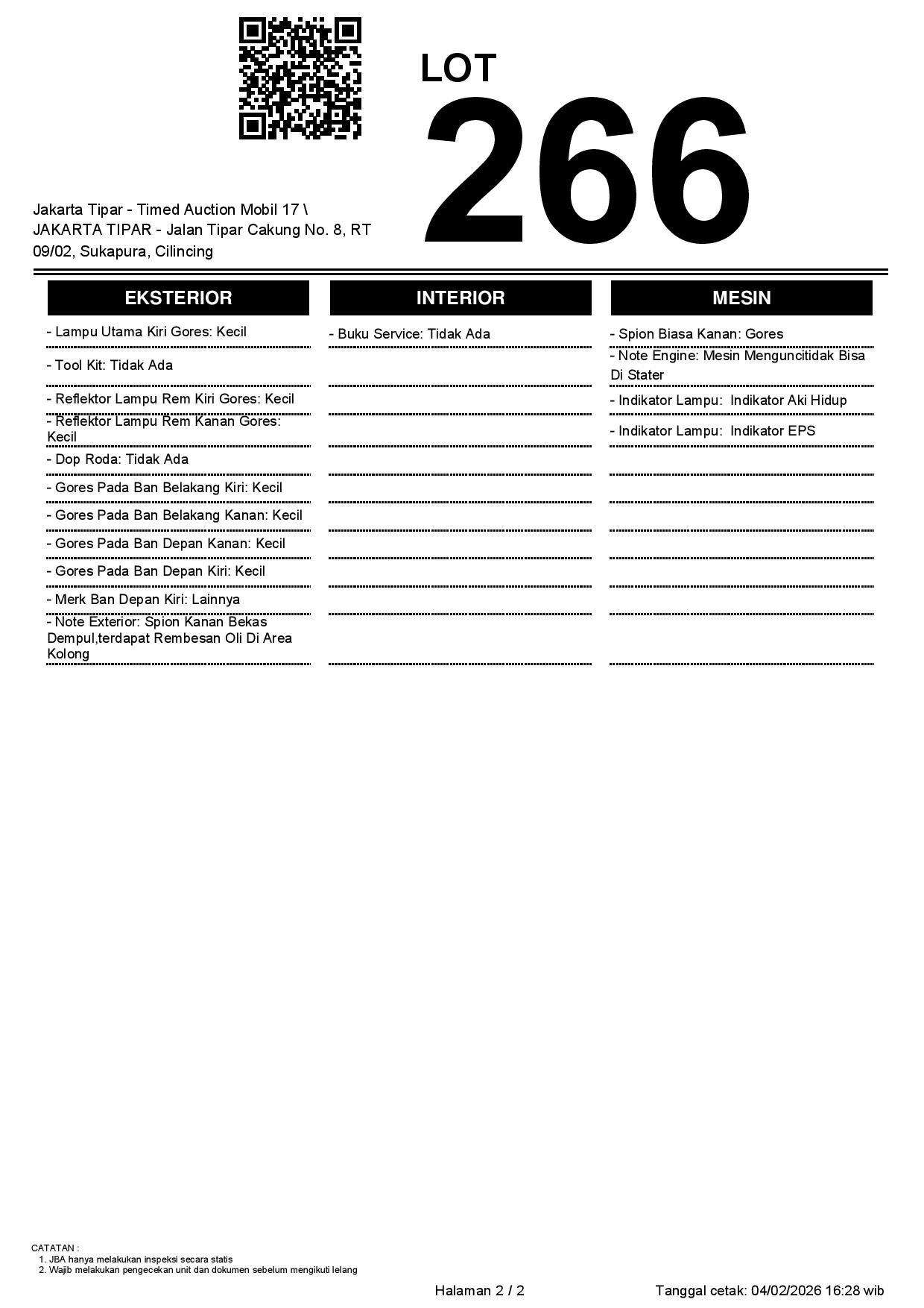 - Kondisi objek lelang dilelang apa adanya, baik kondisi fisik, mesin maupun legalitas kendaraan. Jika terdapat kekurangan/cacat baik yang terlihat maupun yang tidak terlihat, maka semua akan menjadi tanggung jawab/risiko Pemenang Lelang. Oleh karena itu, Pemenang Lelang melepaskan segala hak untuk menuntut dan/atau meminta ganti rugi atas hal tersebut kepada JBA.