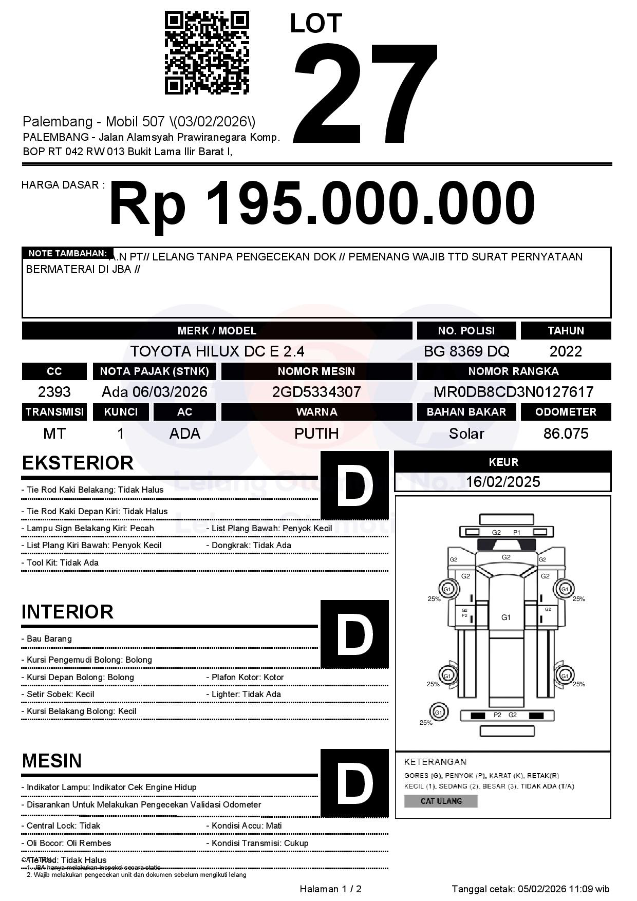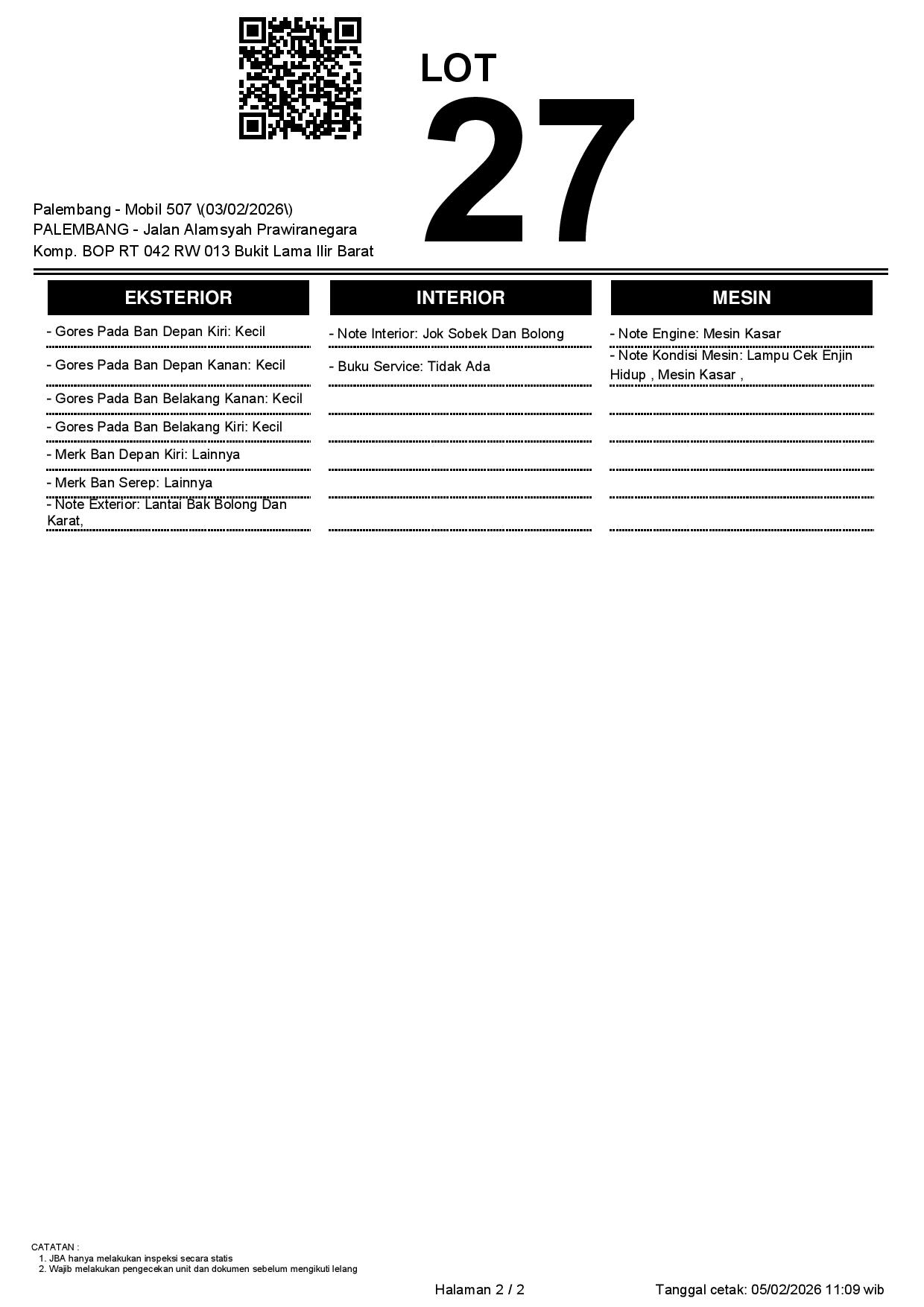 - Kondisi objek lelang dilelang apa adanya, baik kondisi fisik, mesin maupun legalitas kendaraan. Jika terdapat kekurangan/cacat baik yang terlihat maupun yang tidak terlihat, maka semua akan menjadi tanggung jawab/risiko Pemenang Lelang. Oleh karena itu, Pemenang Lelang melepaskan segala hak untuk menuntut dan/atau meminta ganti rugi atas hal tersebut kepada JBA.