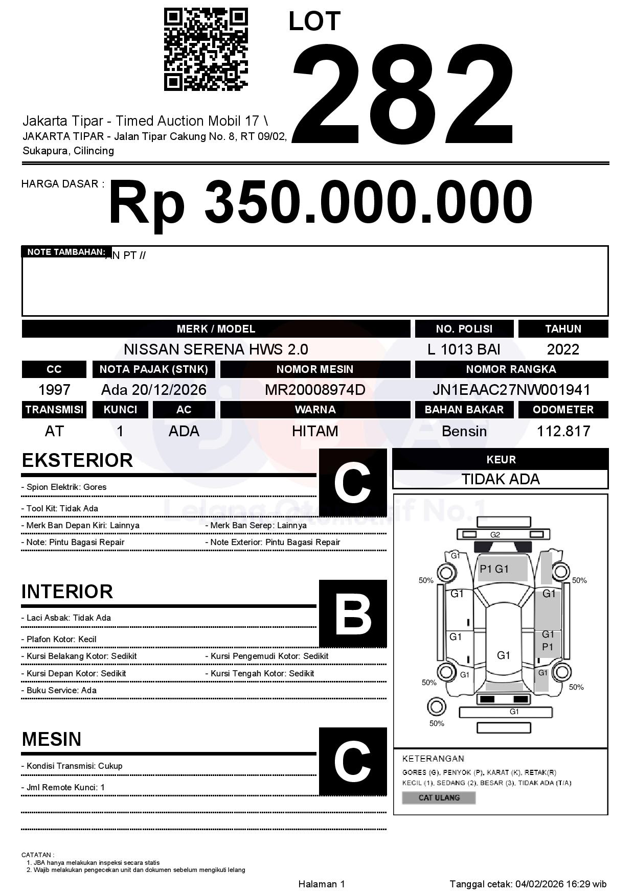 - Kondisi objek lelang dilelang apa adanya, baik kondisi fisik, mesin maupun legalitas kendaraan. Jika terdapat kekurangan/cacat baik yang terlihat maupun yang tidak terlihat, maka semua akan menjadi tanggung jawab/risiko Pemenang Lelang. Oleh karena itu, Pemenang Lelang melepaskan segala hak untuk menuntut dan/atau meminta ganti rugi atas hal tersebut kepada JBA.