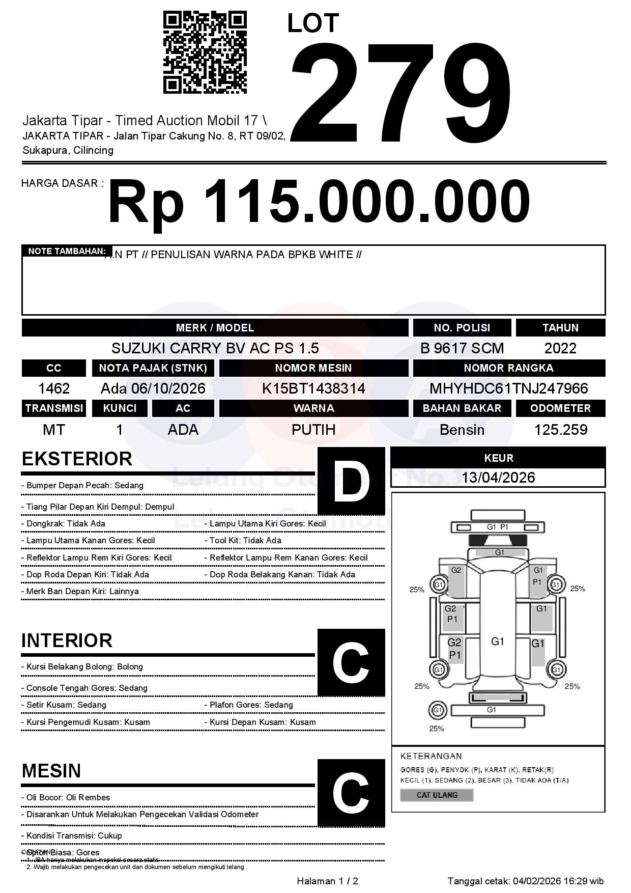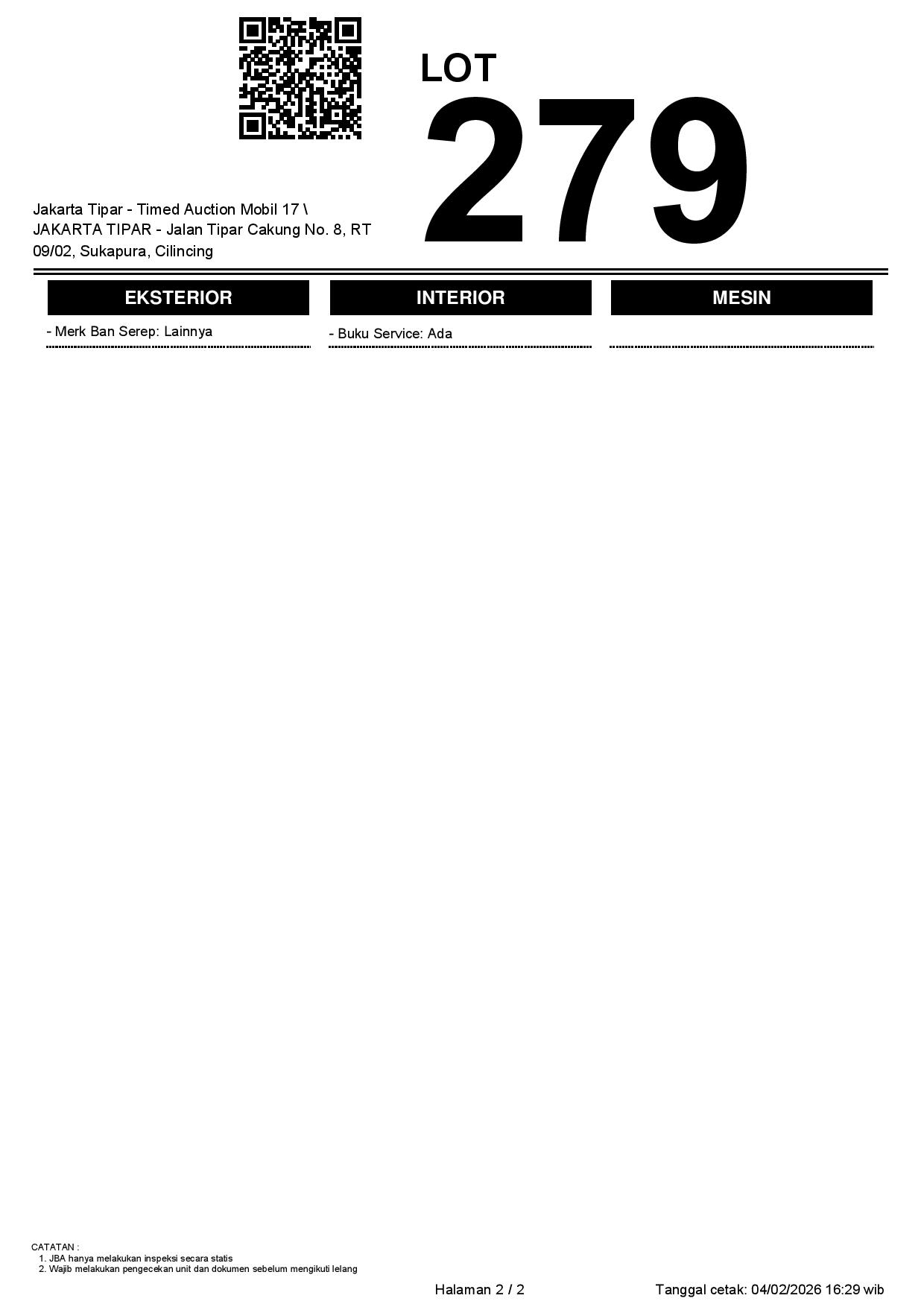 - Kondisi objek lelang dilelang apa adanya, baik kondisi fisik, mesin maupun legalitas kendaraan. Jika terdapat kekurangan/cacat baik yang terlihat maupun yang tidak terlihat, maka semua akan menjadi tanggung jawab/risiko Pemenang Lelang. Oleh karena itu, Pemenang Lelang melepaskan segala hak untuk menuntut dan/atau meminta ganti rugi atas hal tersebut kepada JBA.