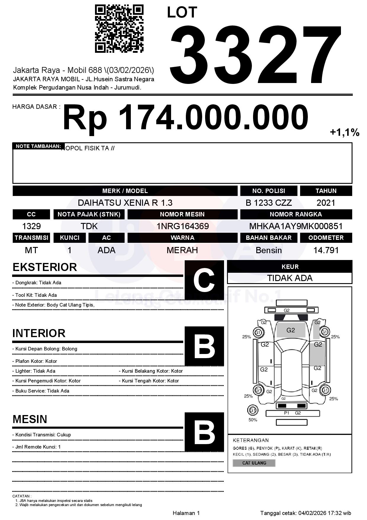 - Kondisi objek lelang dilelang apa adanya, baik kondisi fisik, mesin maupun legalitas kendaraan. Jika terdapat kekurangan/cacat baik yang terlihat maupun yang tidak terlihat, maka semua akan menjadi tanggung jawab/risiko Pemenang Lelang. Oleh karena itu, Pemenang Lelang melepaskan segala hak untuk menuntut dan/atau meminta ganti rugi atas hal tersebut kepada JBA.